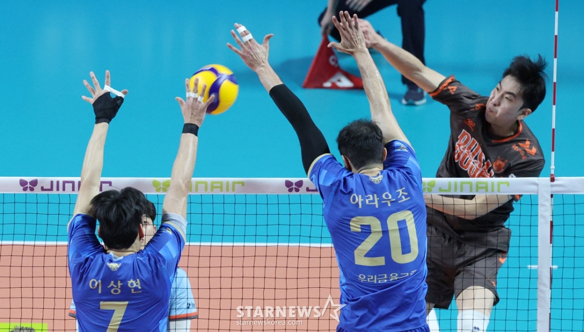 OK Savings Bank's Cha Ji-hwan is sending a strong spike over Woori Card's Lee Sang-hyun and Arauzo's blocks.