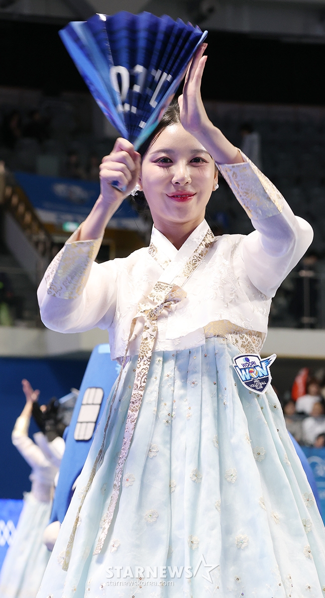 Woori Card cheerleader Won Min-joo is wearing hanbok and cheering for the Lunar New Year special.
