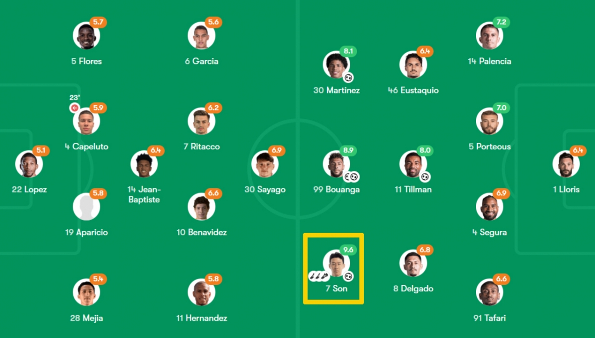 Los Angeles FC Son Heung-min (34) has been performing very well since his first official game of the season. He has four offensive points (one goal, three assists) accumulated in the first 45 minutes of the first half, and he has already scored 9.6 points in the first half.