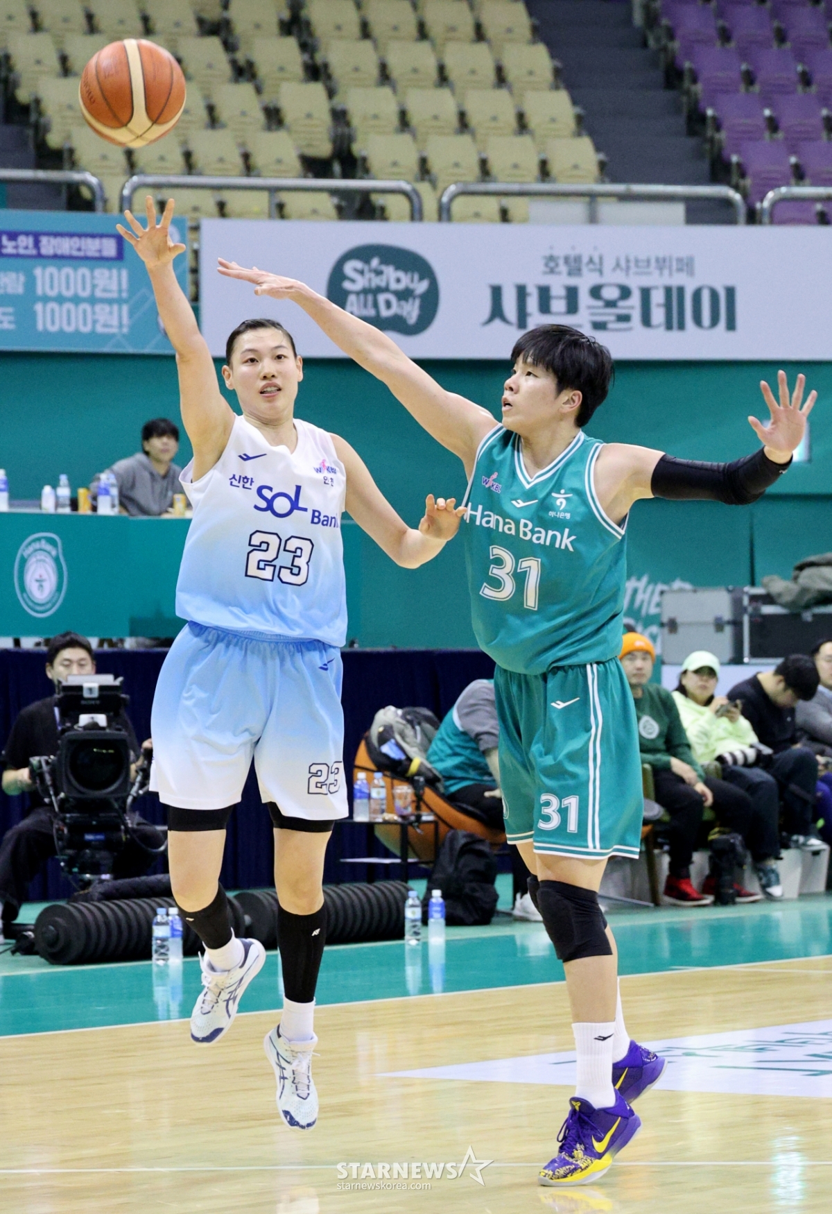 Shinhan Hong Yoo-soon is trying to shoot with Jinan's mark in the BNK Financial Group 2025-2026 WKBL Hana Bank and Shinhan Bank match held at Bucheon Indoor Gymnasium on the 20th. 2026.02.20.