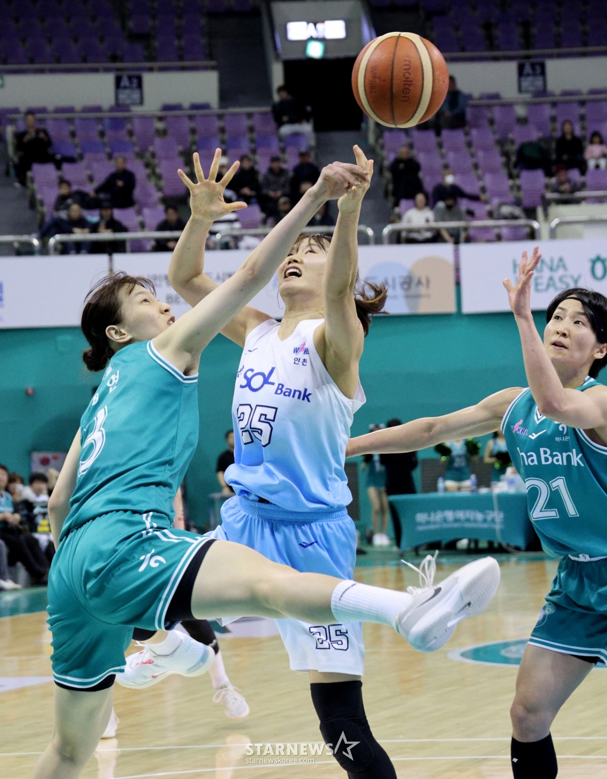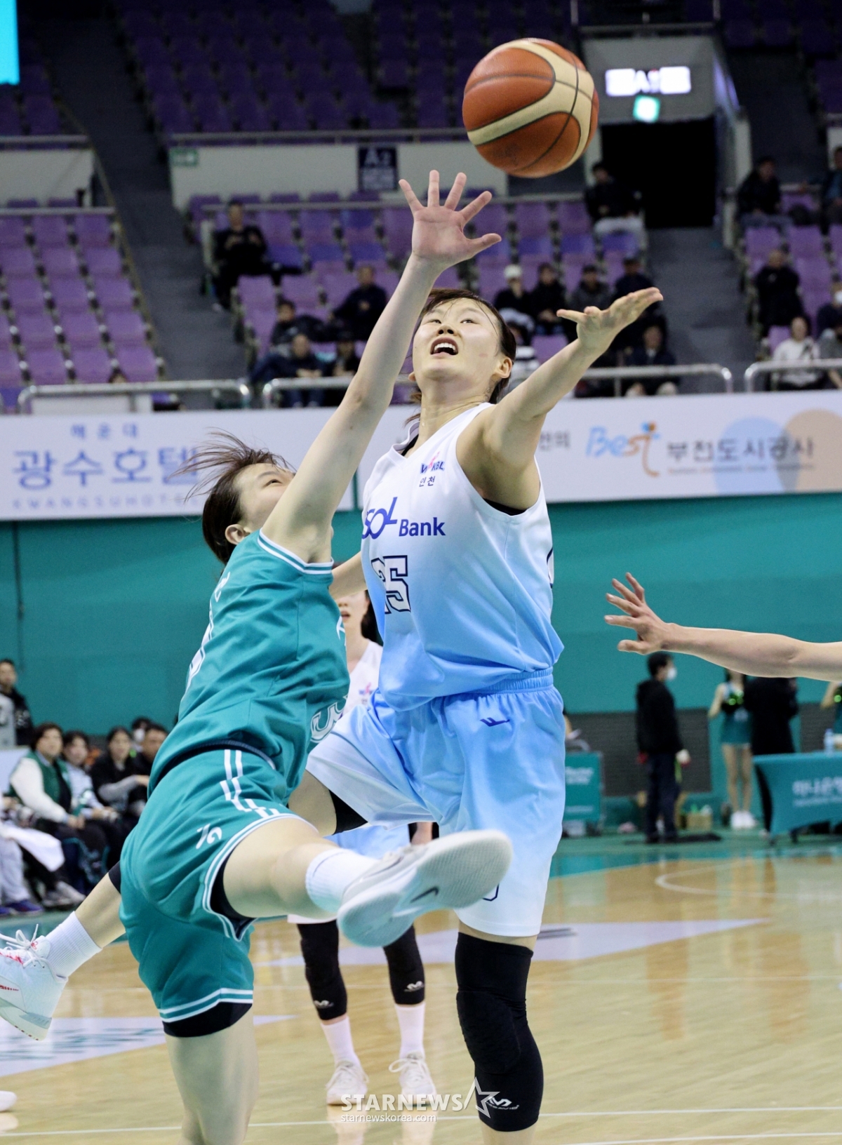 Shinhan Mima Louie is in a fierce ribaud fight with Chung Hyeon in a match between BNK Financial Group 2025-2026 WKBL Hana Bank and Shinhan Bank at Bucheon Indoor Gymnasium on the 20th. 2026.02.20.