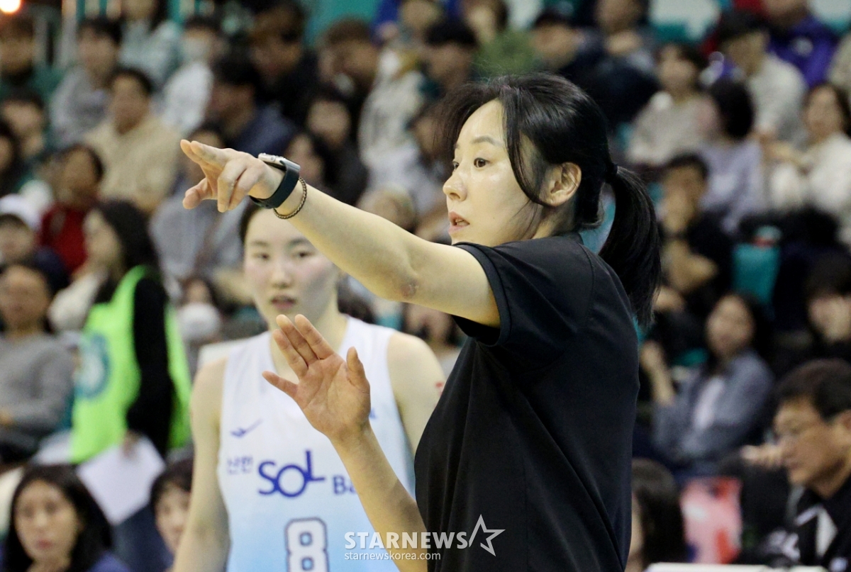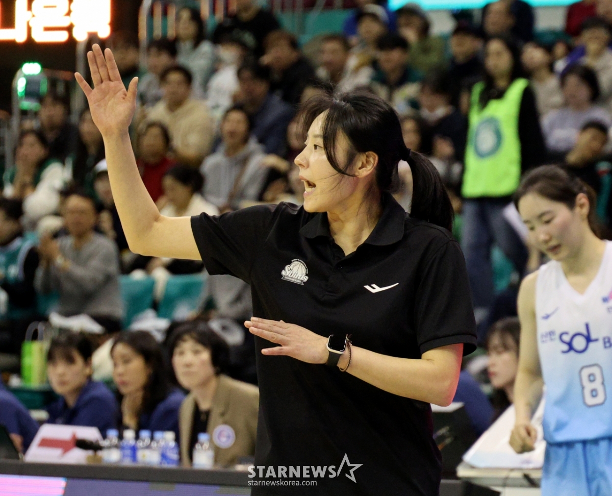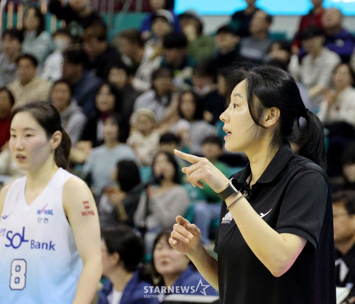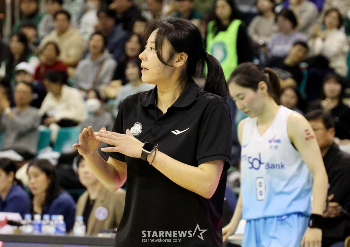 Shinhan manager Choi Yoon-ah is immersed in thoughts at the BNK Financial Group 2025-2026 WKBL Hana Bank and Shinhan Bank match held at Bucheon Indoor Gymnasium on the 20th. 2026.02.20.