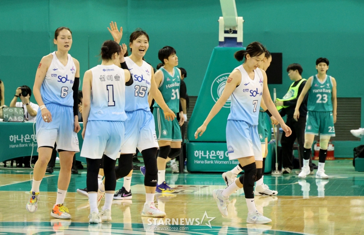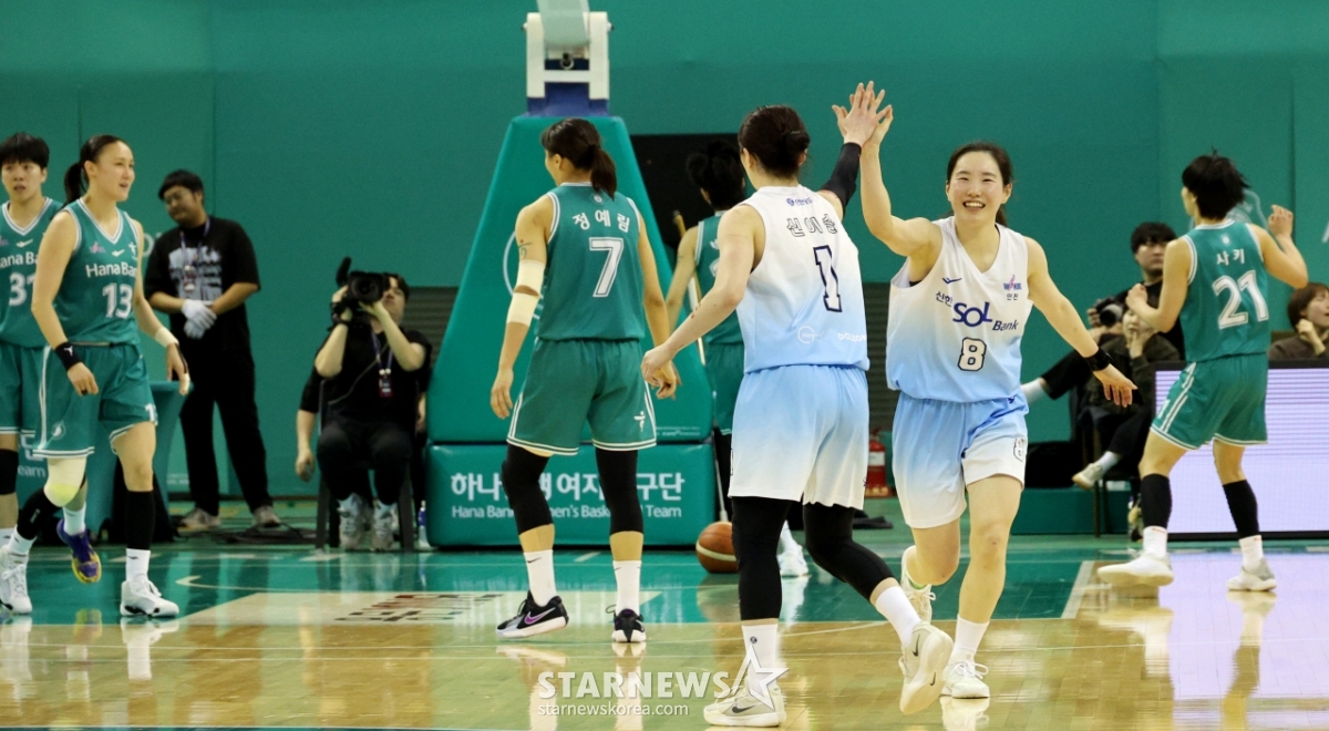 Shinhan players are sharing high fives after winning the fourth quarter of the match between BNK Financial Group 2025-2026 WKBL Hana Bank and Shinhan Bank at Bucheon Indoor Gymnasium on the 20th. 2026.02.20.
