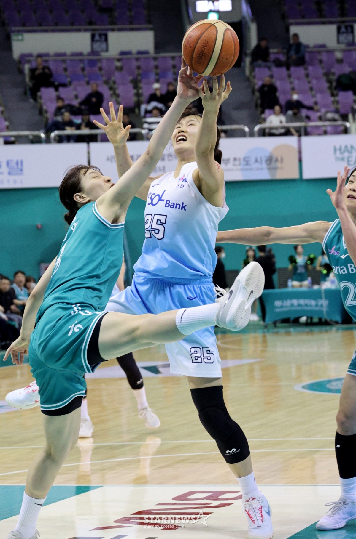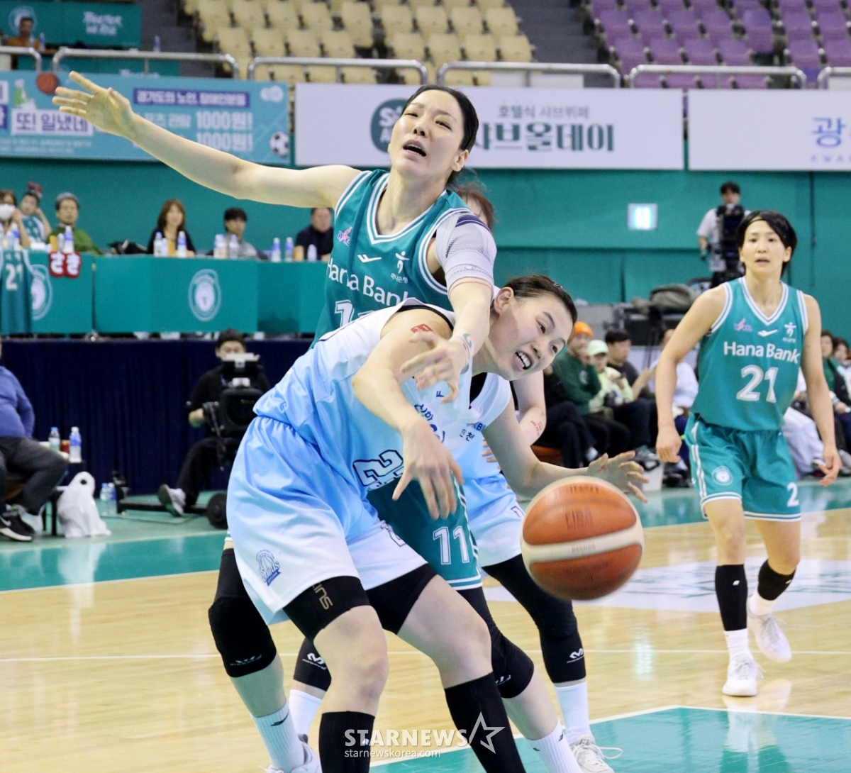 Shinhan Mima Louie is in a fierce rebound battle with Chung Hyeon in a match between BNK Financial Group 2025-2026 WKBL Hana Bank and Shinhan Bank at Bucheon Indoor Gymnasium on the 20th.