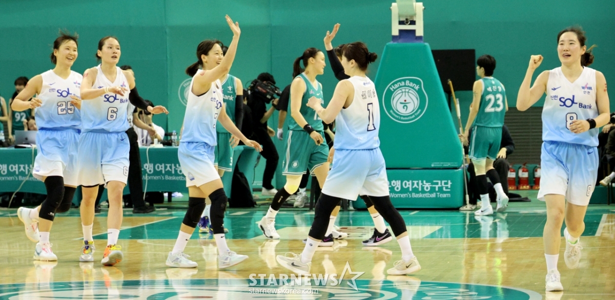 Shinhan players are sharing high fives after winning the fourth quarter of the match between BNK Financial Group 2025-2026 WKBL Hana Bank and Shinhan Bank at Bucheon Indoor Gymnasium on the 20th.