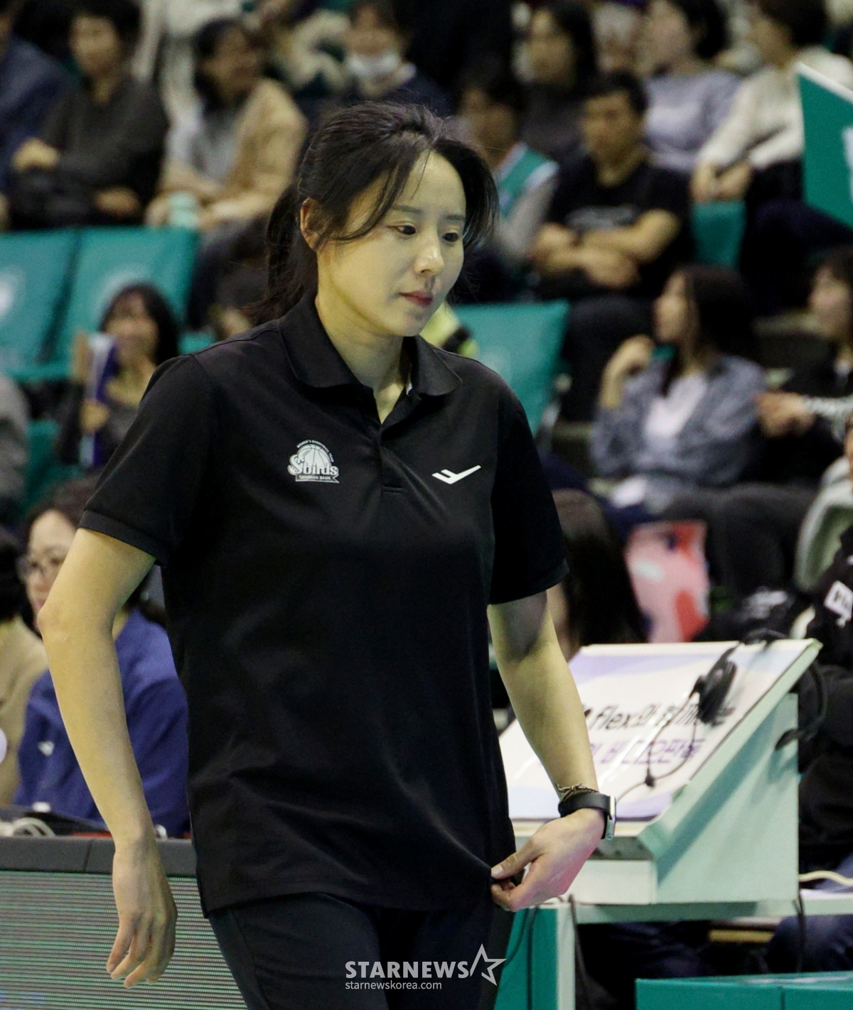 Shinhan manager Choi Yoon-ah is immersed in thoughts at the BNK Financial Group 2025-2026 WKBL Hana Bank and Shinhan Bank match held at Bucheon Indoor Gymnasium on the 20th. Choi Yoon-ah's first win was at home against Hana Bank.