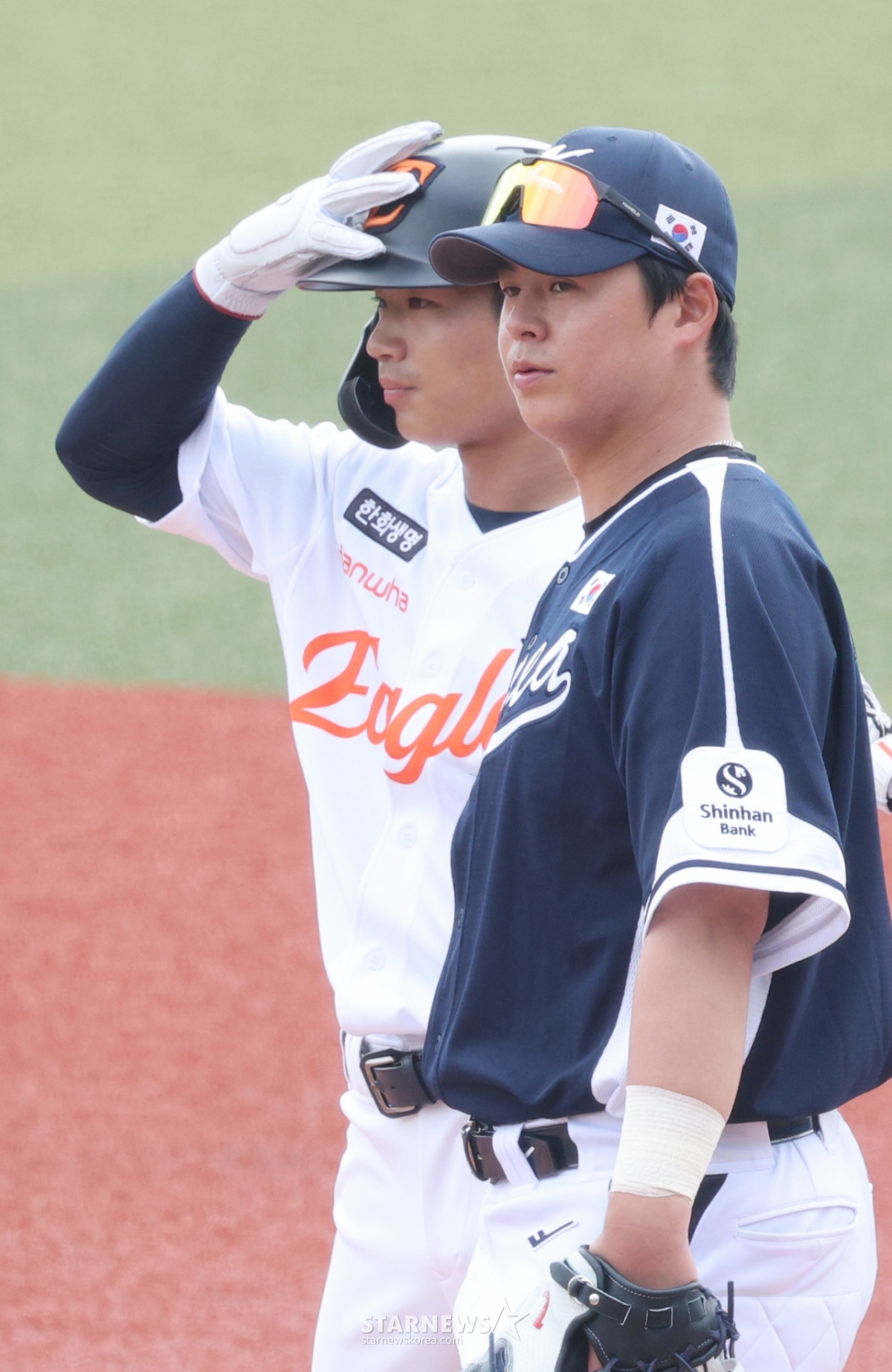 Hanwha Oh Jae-won is talking to national team Noh Si-hwan as a pinch runner in the bottom of the fifth inning.