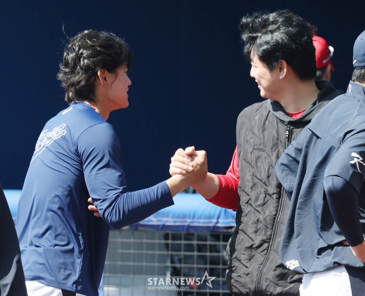 Kim Do-young of the national team is visiting KIA coach Son Seung-rak to greet him.