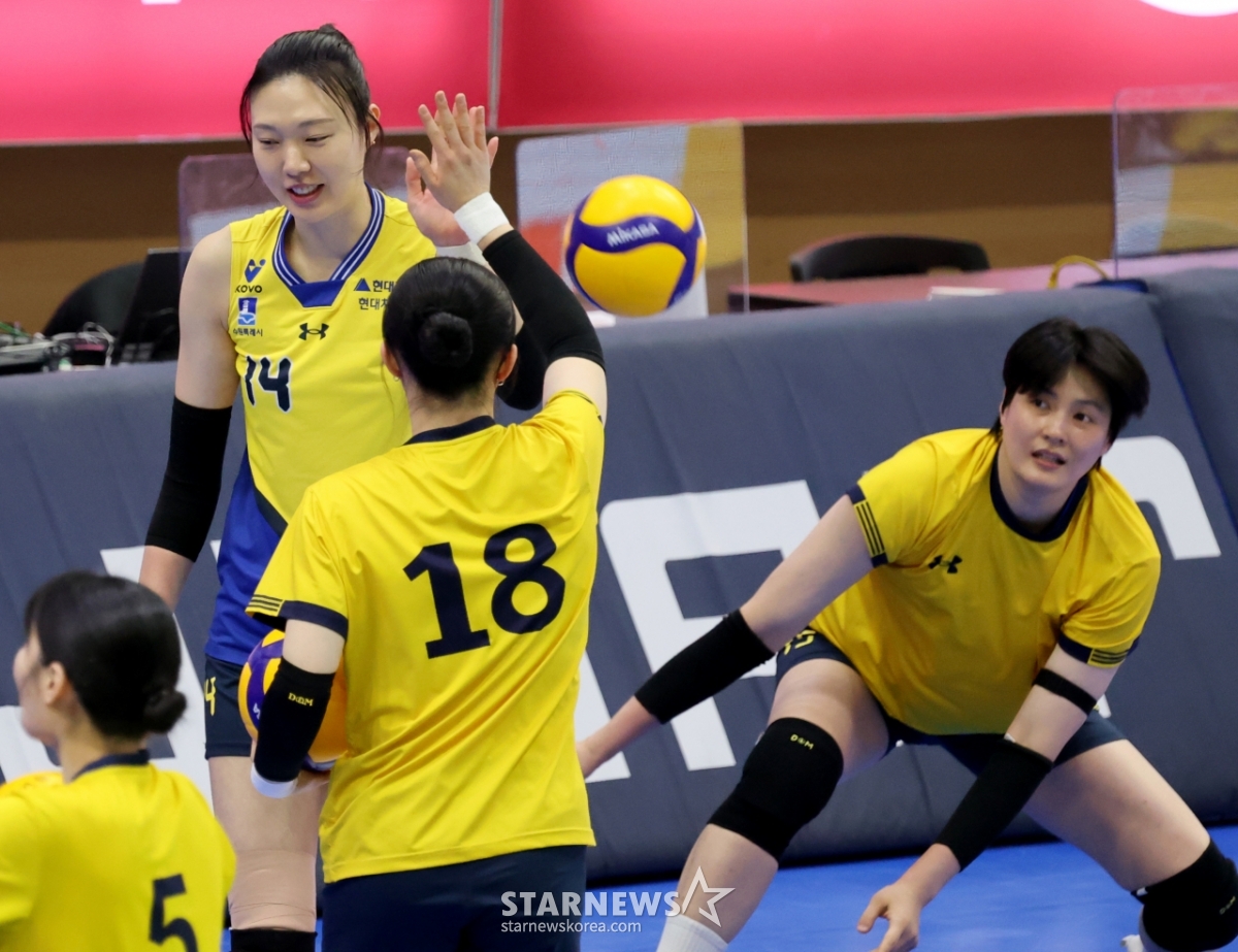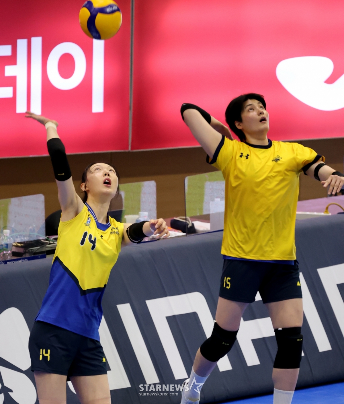 Hyundai Engineering & Construction Yang Hyo-jin and Kim Hee-jin are warming up before the Jin Air 2025-2026 V League Women's match between Hyundai Engineering & Construction and Korea Expressway Corporation at Suwon Gymnasium on the 24th. 2026.02.24.