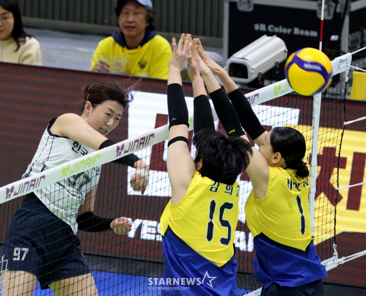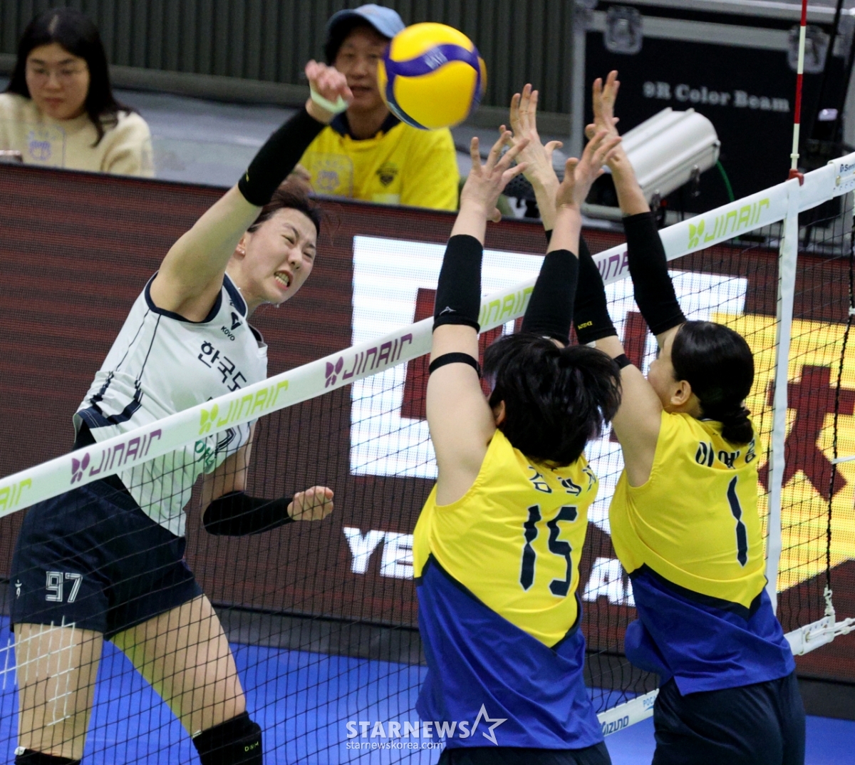 Kang So-hwi of the Korea Expressway Corporation is hitting Hyundai Double Blocking in a match between Hyundai Engineering & Construction and Korea Expressway Corporation in the women's division of Jin Air 2025-2026V League at Suwon Gymnasium on the 24th. 2026.02.24.