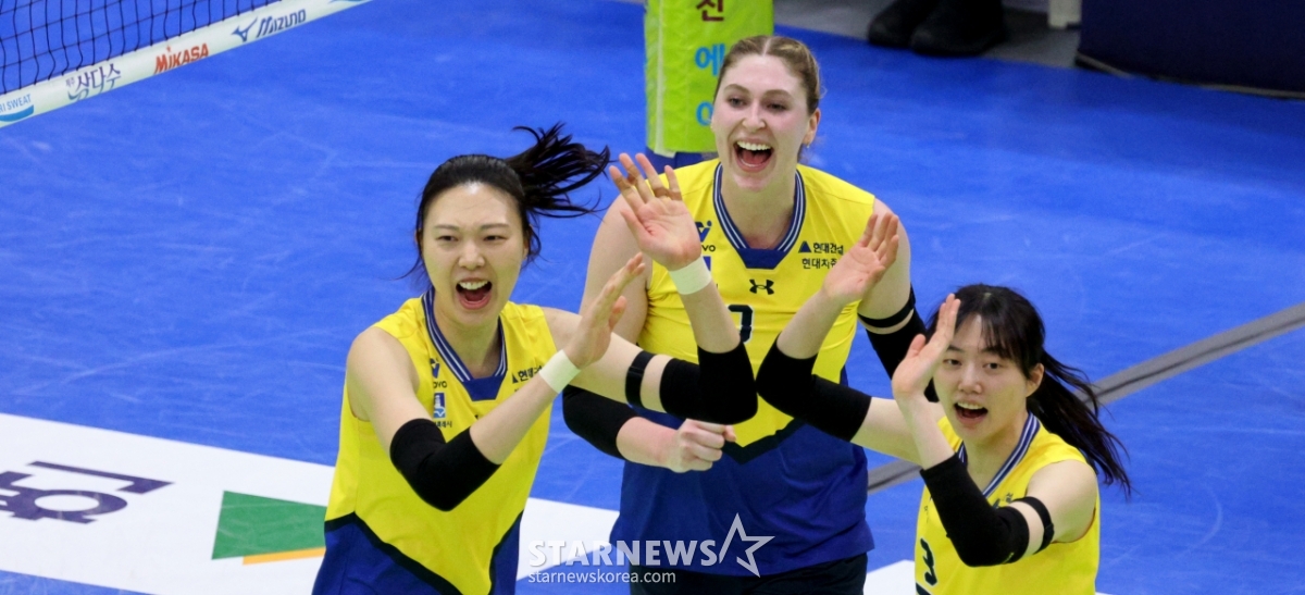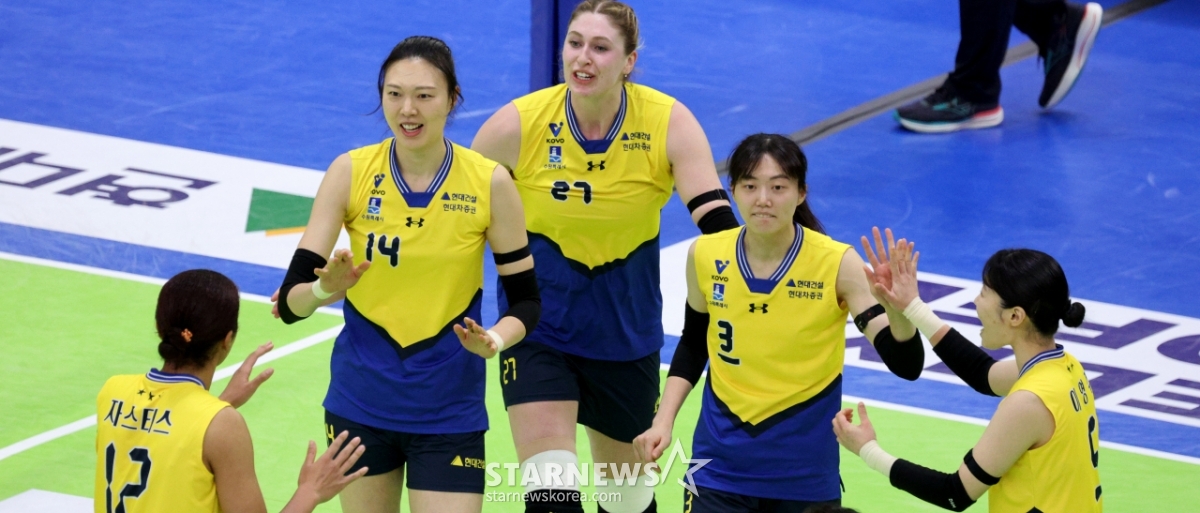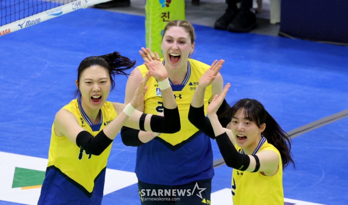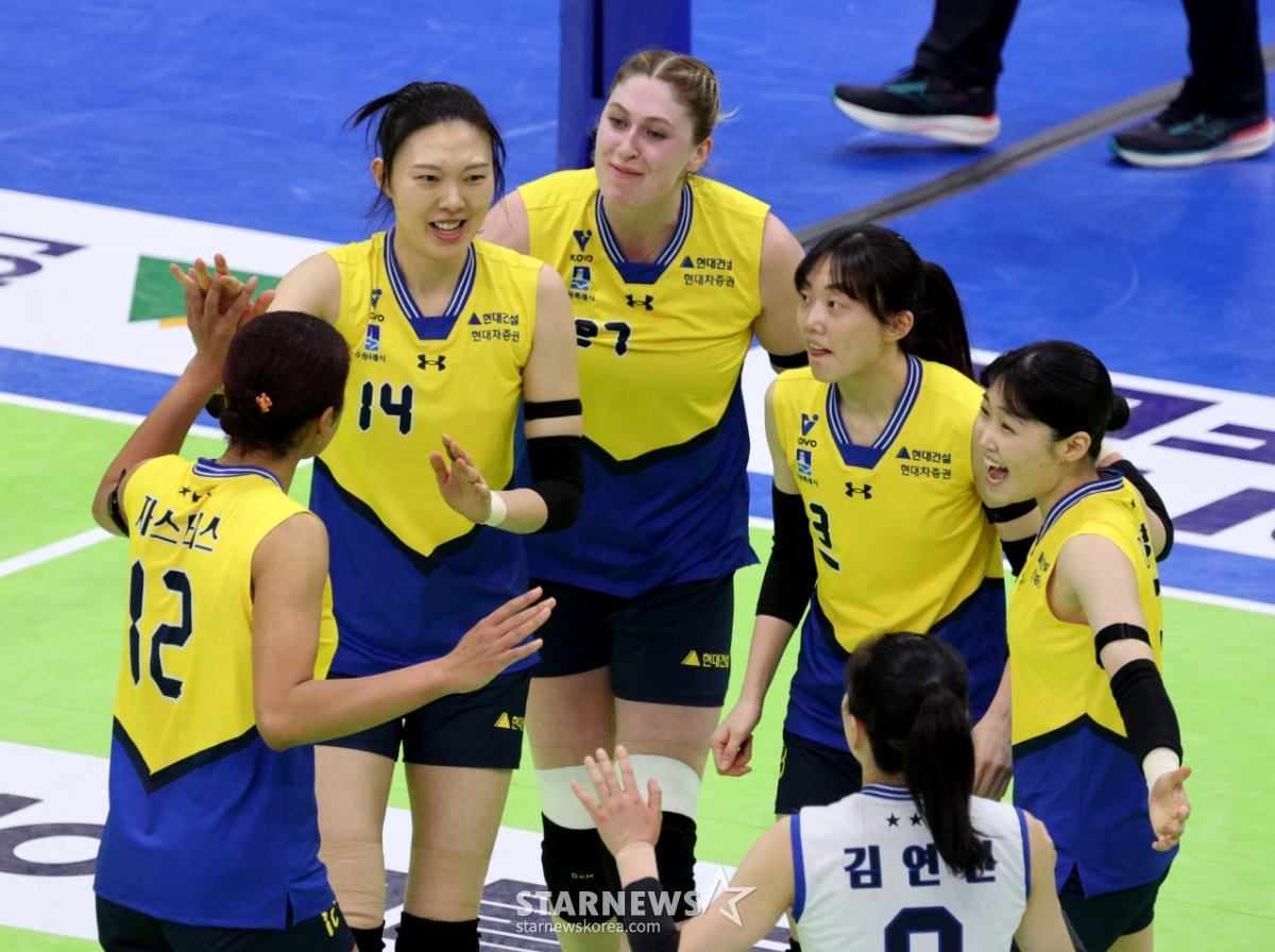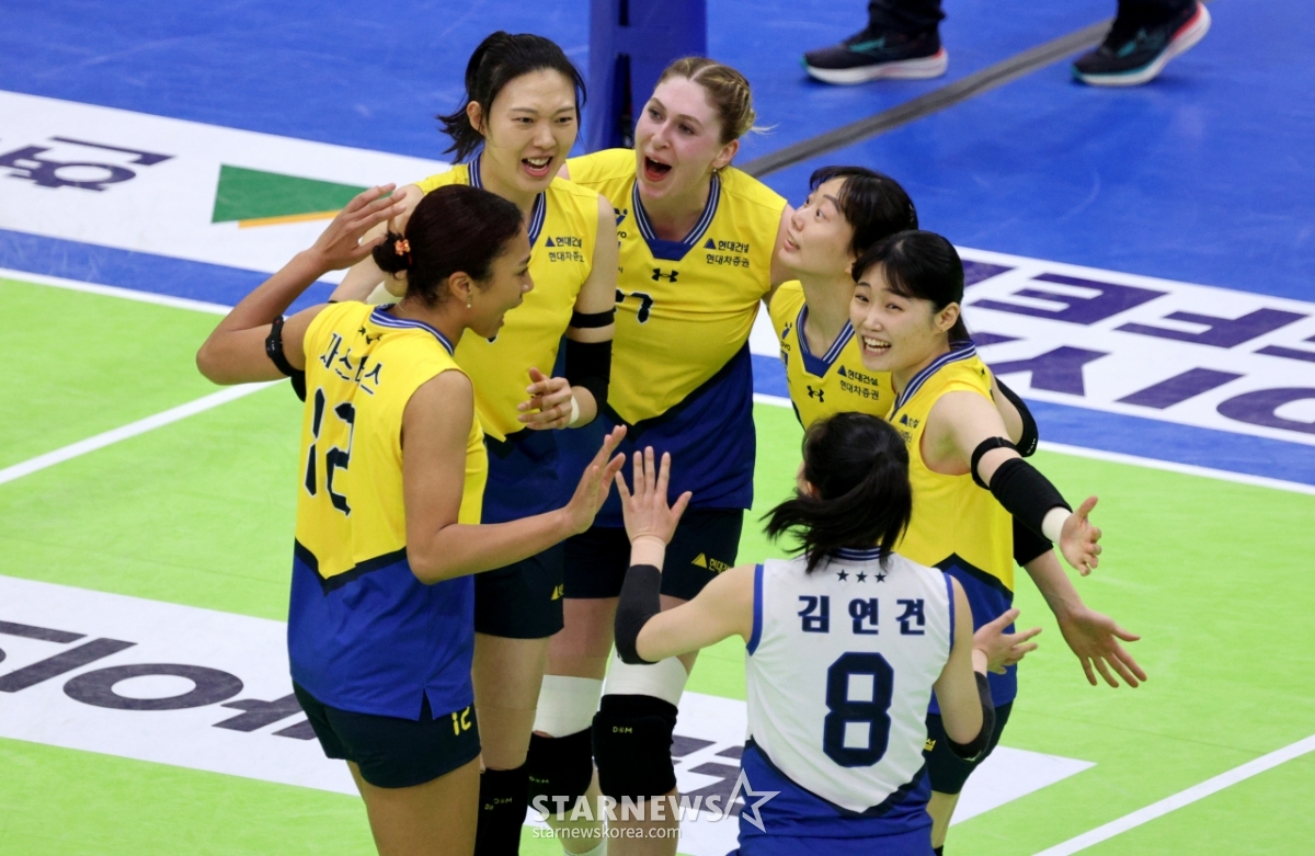 Hyundai Yang Hyo-jin celebrates with his teammates after blocking Moma's hard hit at the end of the first set of the Jin Air 2025-2026V League Women's Division Hyundai Engineering & Construction and Korea Expressway Corporation at Suwon Gymnasium on the 24th.