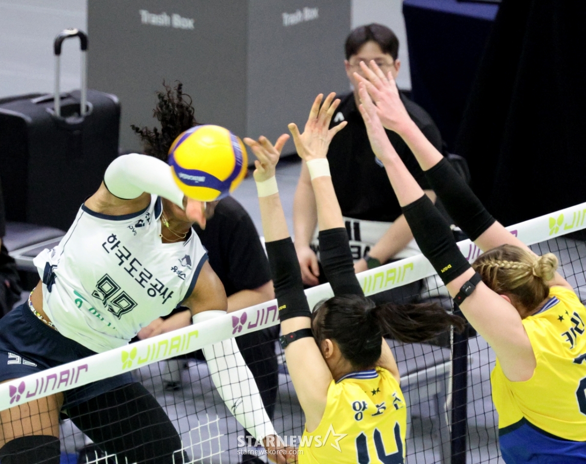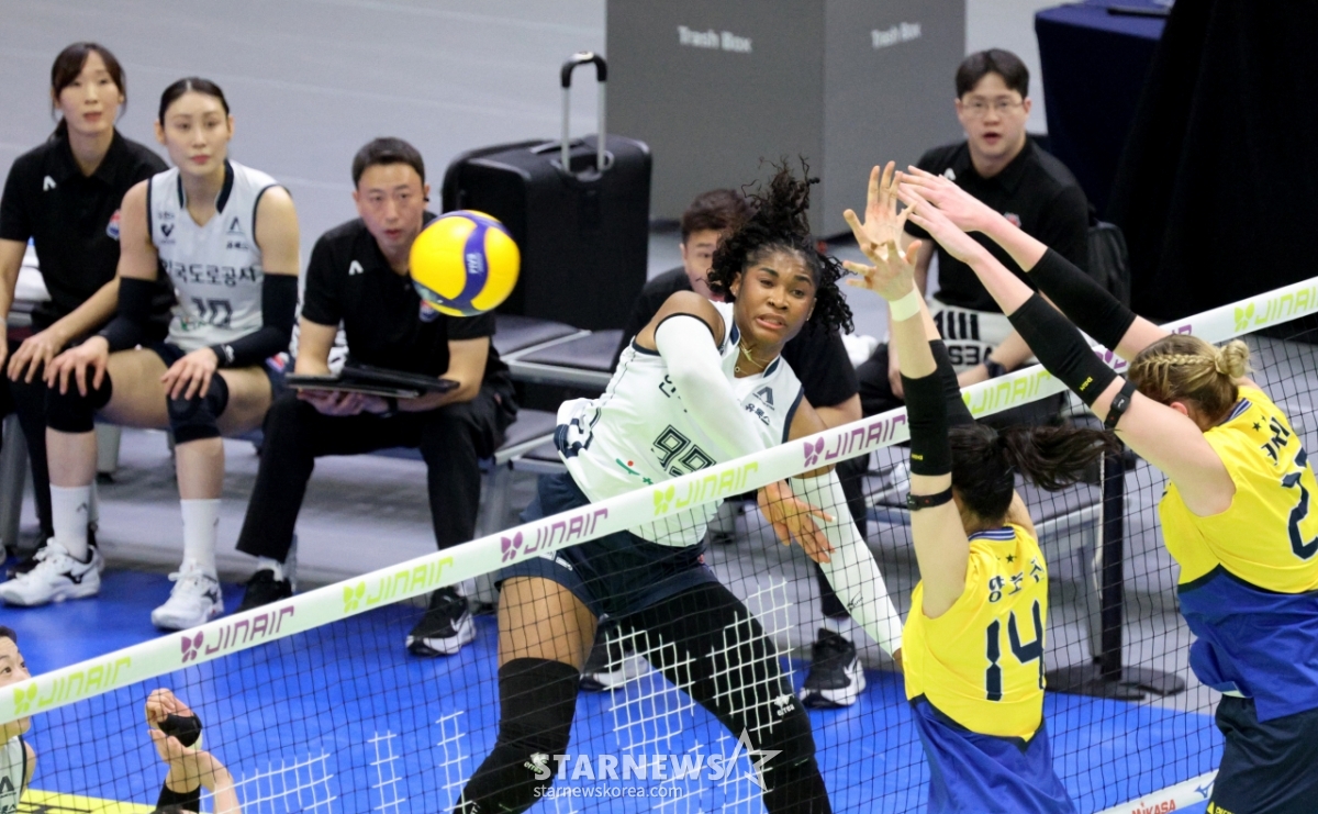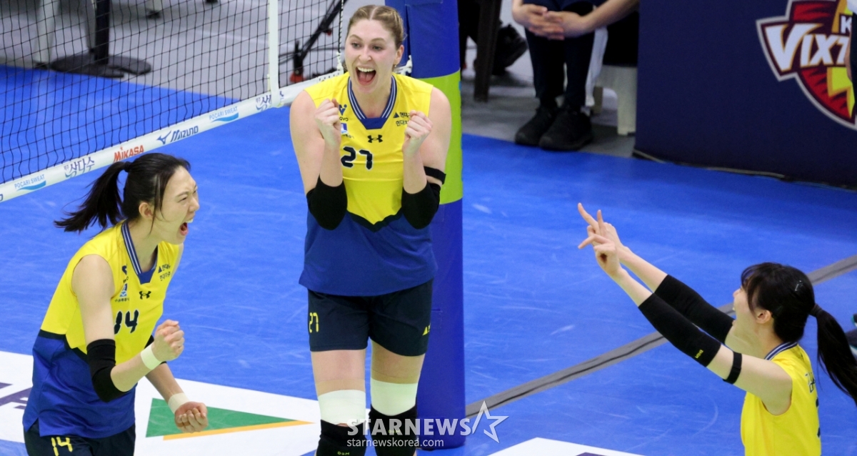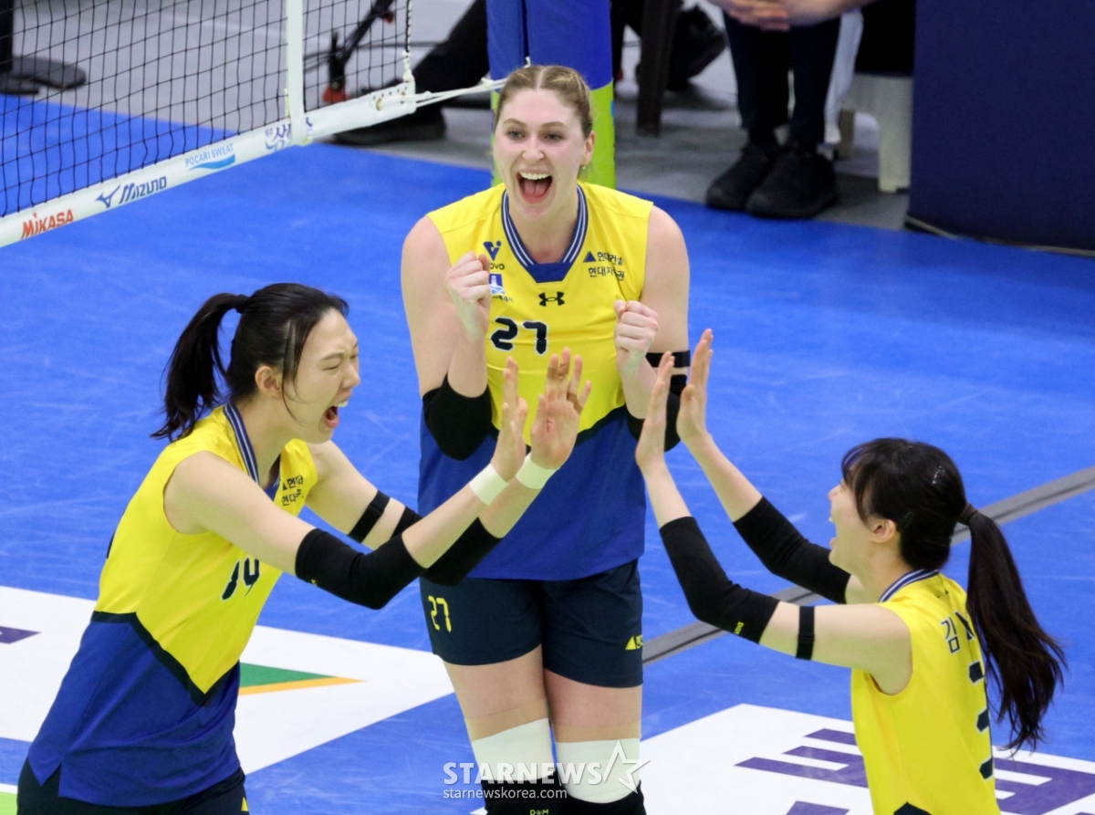 Hyundai Yang Hyo-jin celebrates with his teammates after blocking Moma's hard hit at the end of the first set of the Jin Air 2025-2026V League Women's Division Hyundai Engineering & Construction and Korea Expressway Corporation at Suwon Gymnasium on the 24th.