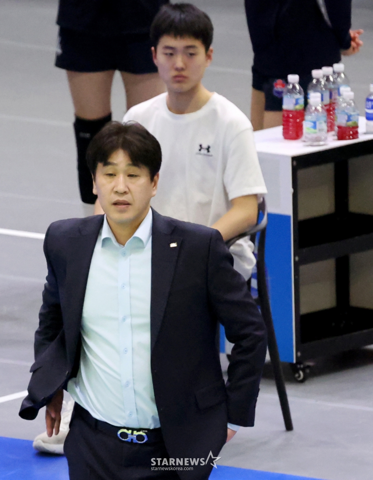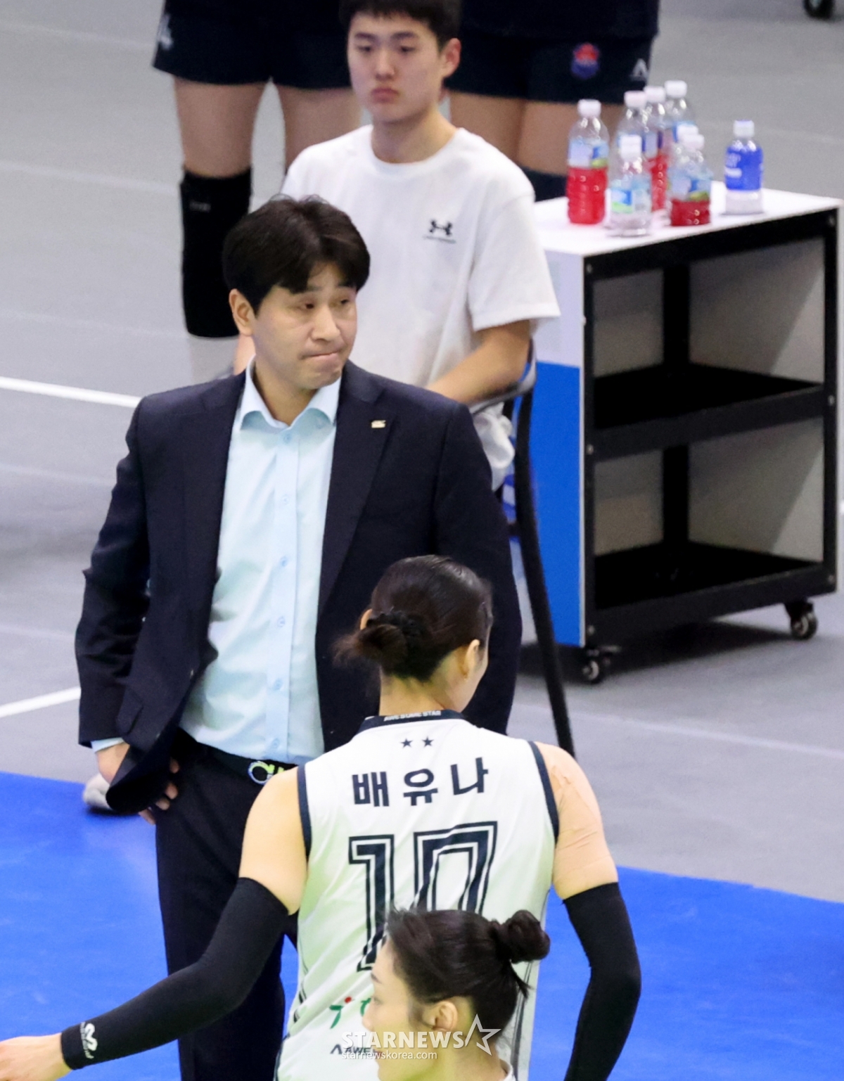 Korea Expressway Corporation head coach Kim Jong-min is encouraging players in a match between Hyundai Engineering & Construction and Korea Expressway Corporation in the women's team of Jin Air 2025-2026 V League held at Suwon Gymnasium on the 24th.. 2026.02.24.