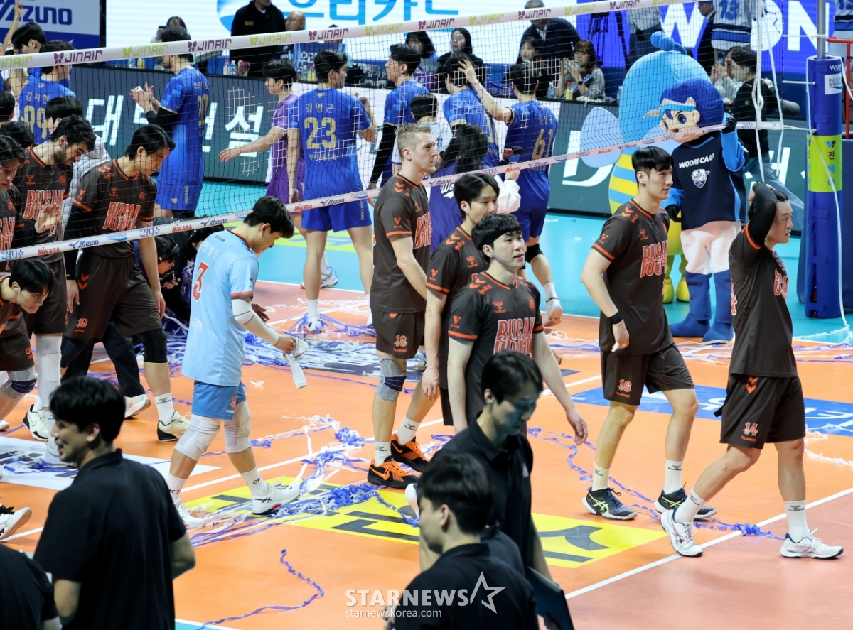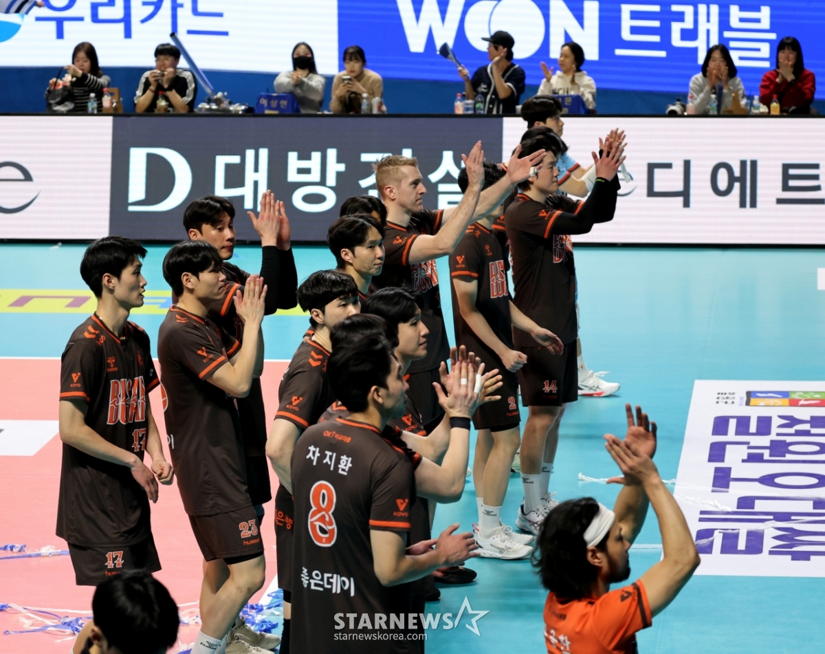 OK Savings Bank players are taking a disappointing Red Card after losing the Jin Air 2025-2026 V-League men's match between Woori Card and OK Savings Bank at Jangchung Gymnasium on the 25th. 2026.02.25.