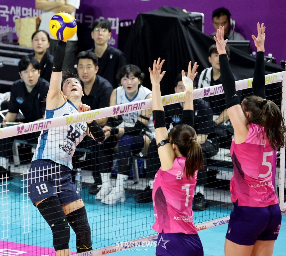GS Yoo Ji-yeon is hitting a double blocking of Heungkuk in a match between Jin Air 2025-2026V League Women's Heungkuk Life Insurance and GS Caltex at Samsan World Gymnasium on the 27th.2026.02.27.
