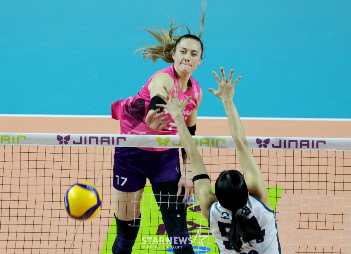 Heungkuk Rebecca hits Oh Se-yeon's block in the women's match between Jin Air 2025-2026V League Heungkuk Life Insurance and GS Caltex at Samsan World Gymnasium on the 27th.2026.02.27.