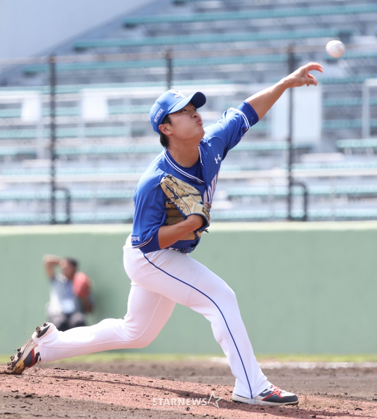 Samsung's Lee Seung-min is pitching hard.