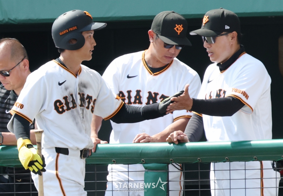 Coach Lee Seung-yeop of the Yomiuri Giants welcomes the player who hit a tying sacrifice hit in the bottom of the fifth inning.