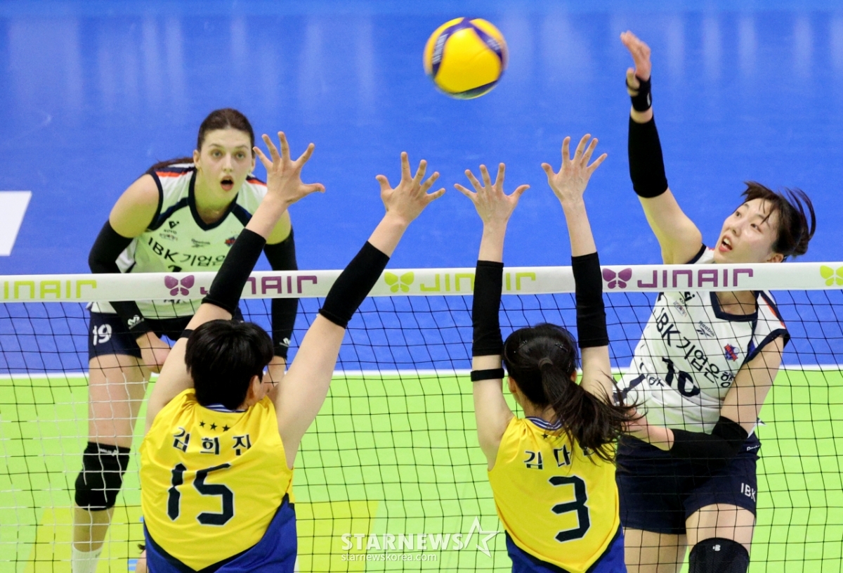 IBK's Ko Eui-jung is hitting the Hyundai double blocking in the women's match between Hyundai Engineering & Construction and IBK Industrial Bank of the Jin Air 2025-2026V League at Suwon Gymnasium on the 28th. 2026.02.28.