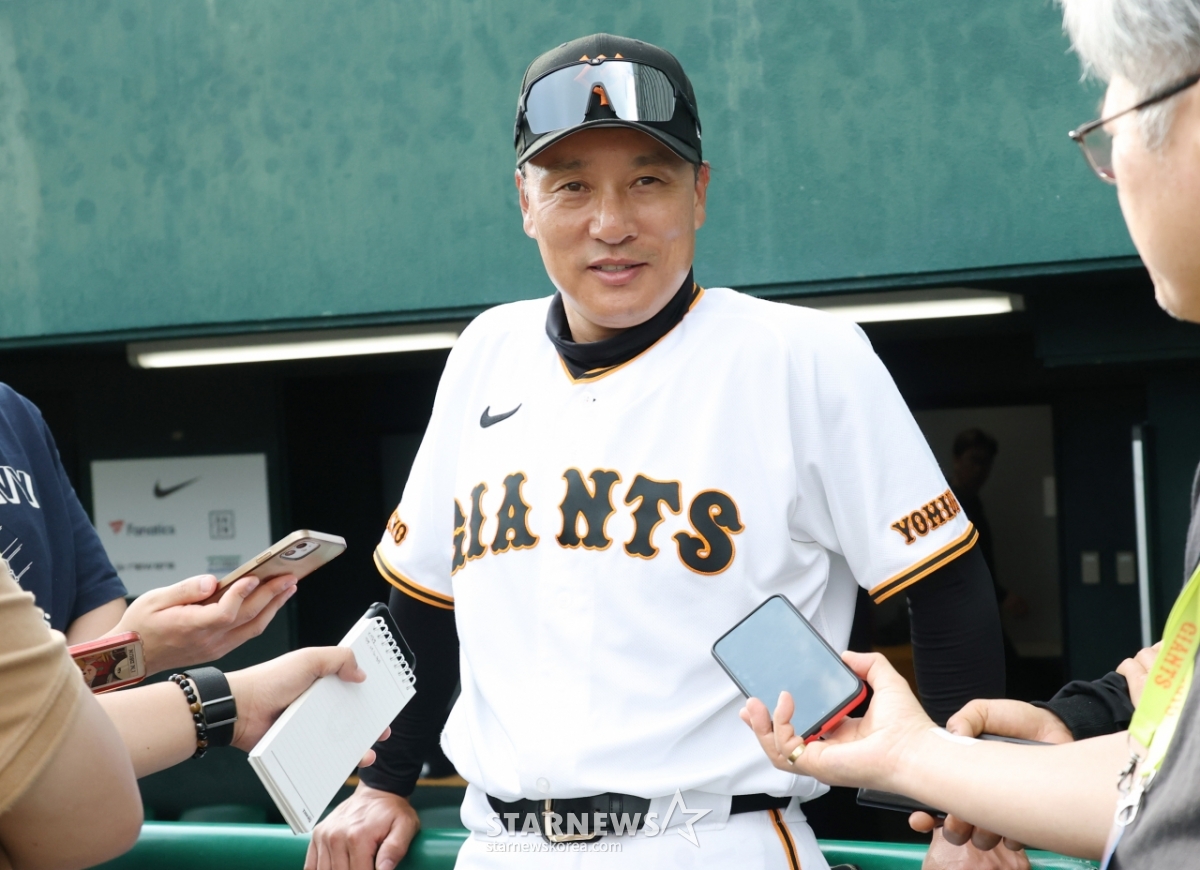 Coach Lee Seung-yeop is interviewing Korean reporters after the game.