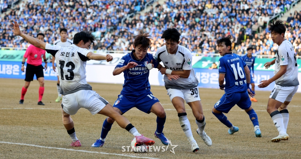 Suwon Samsung's Kim Sung-joo is engaged in a fierce battle with Oh In-pyo and Park Chang-hwan in the 2026 Hana Bank K League 2 match against Suwon Samsung at Suwon World Cup Stadium on the 28th. 2026.02.28.