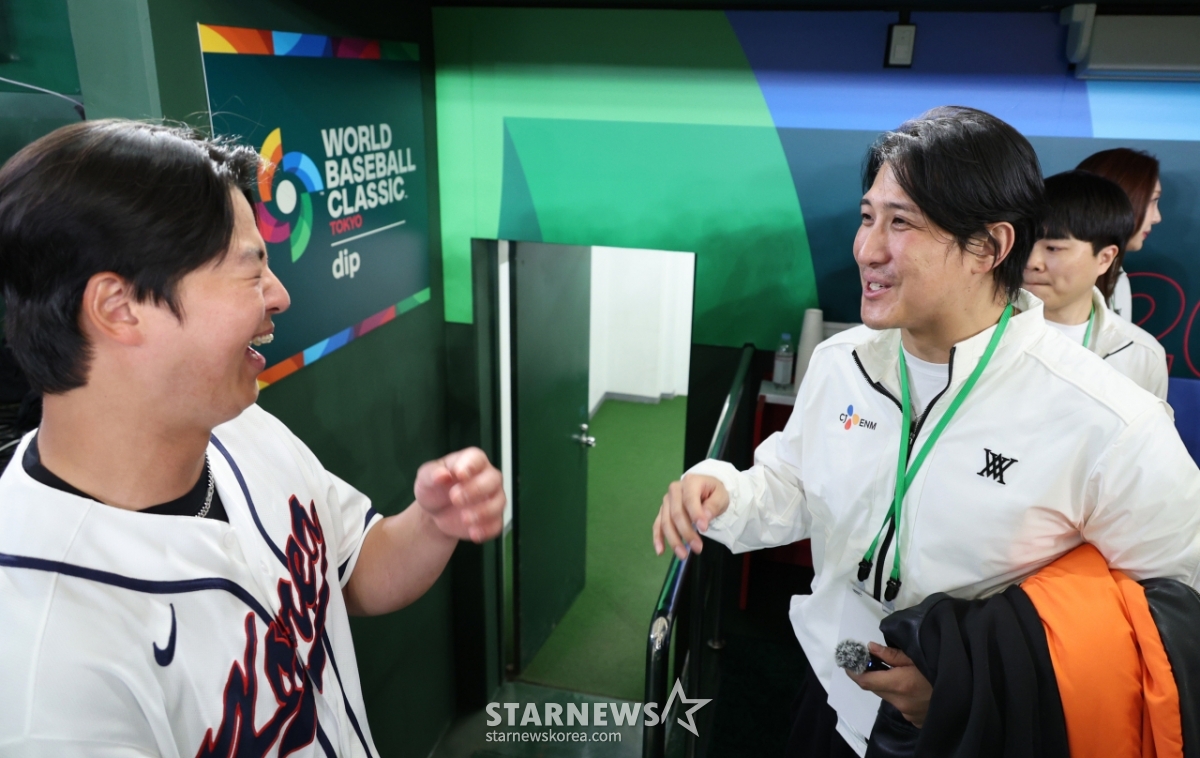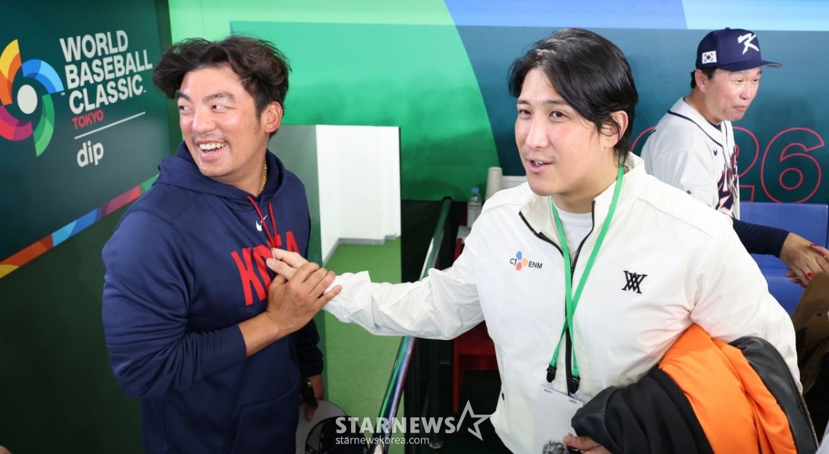 Commentator Hwang Jae-kyun, who turned into a commentator after a professional baseball player, greets Noh Si-hwan, who finished official training at Tokyo Dome on the 4th, a day before the opening of the 2026 WBC Tokyo Round. 2026.03.04.