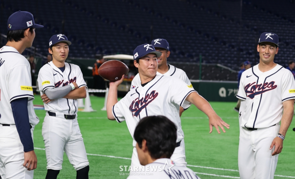 Roh Si-hwan of the national baseball team throws an American football before starting official training at Tokyo Dome on the 4th, a day before the opening of the 2026 WBC Tokyo Round. 2026.03.04.