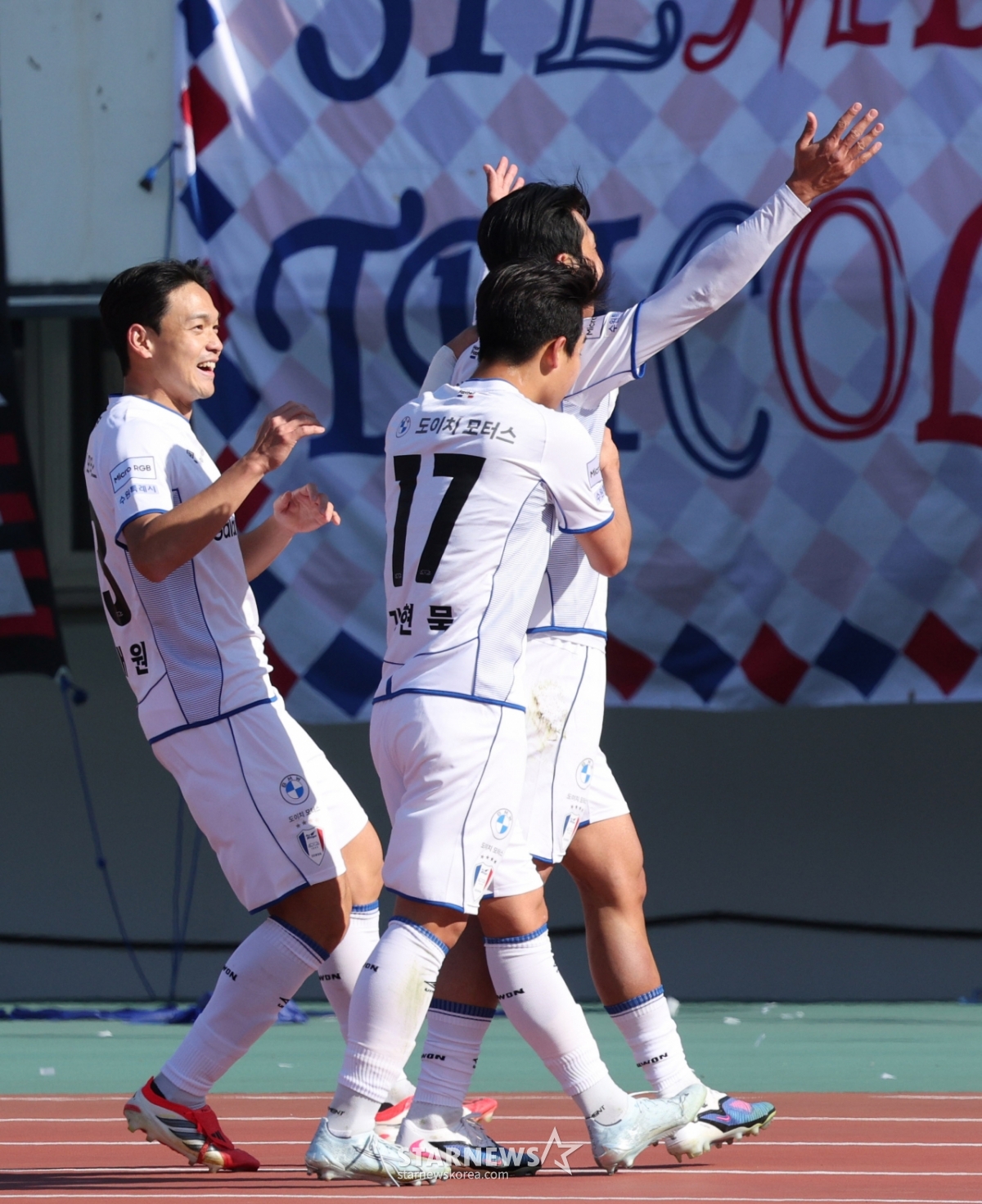Suwon Samsung's Kim Ji-hyun runs to the supporters and shares his joy after scoring his first goal with a header shot.