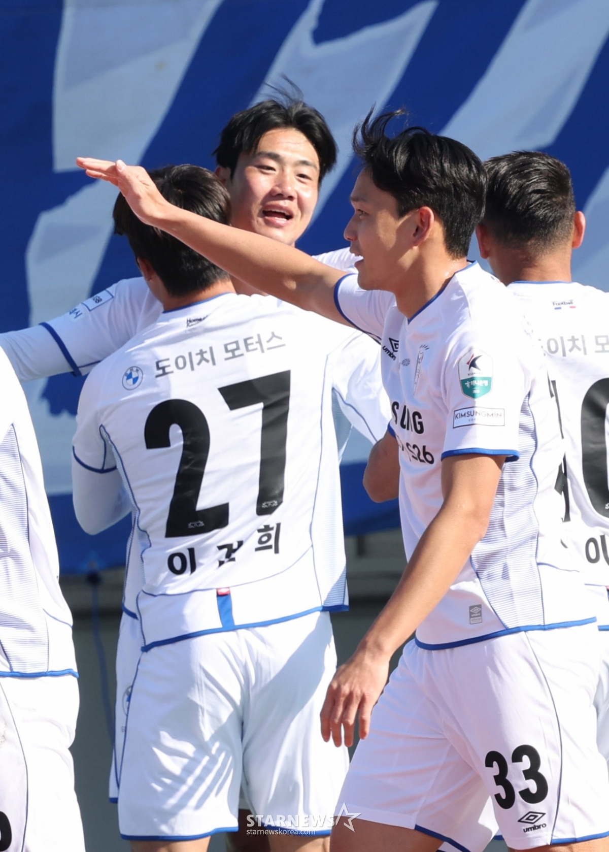 Suwon Samsung's Kim Ji-hyun runs to the supporters and shares his joy after scoring his first goal with a header shot.