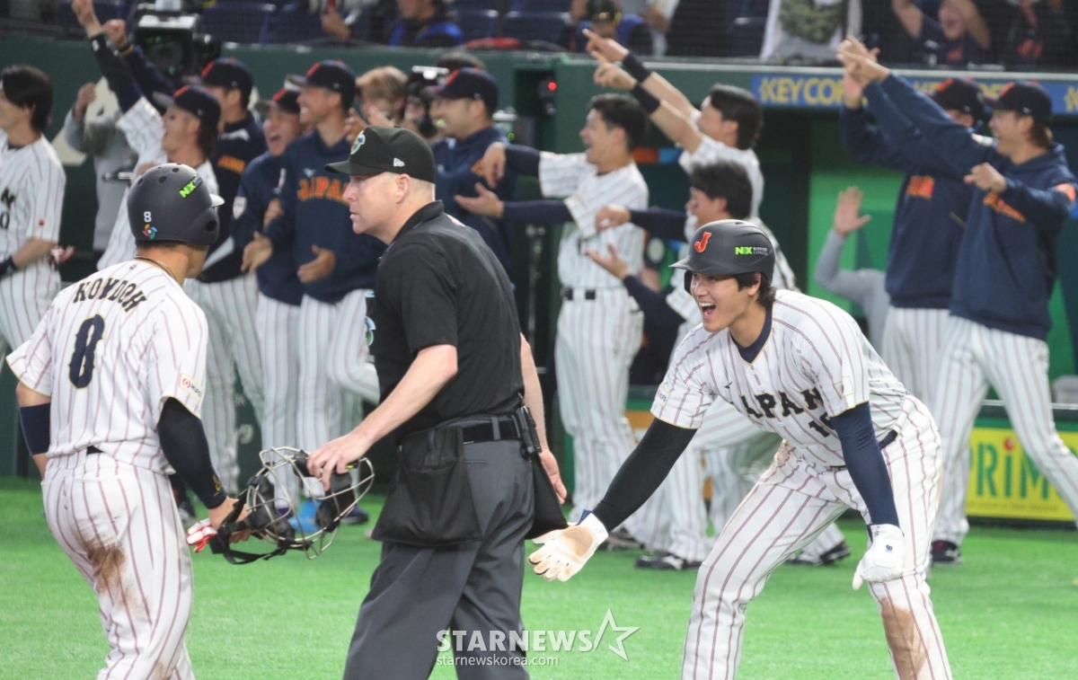 Japan's No. 4 hitter Yoshida hit a two-run timely hit with the bases loaded with two outs in the bottom of the seventh inning of the 2026 WBC Tokyo POOL match between South Korea and Japan at Tokyo Dome on the 7th. Ohtani and Kondo, who scored, are celebrating themselves. 2026.03.07.