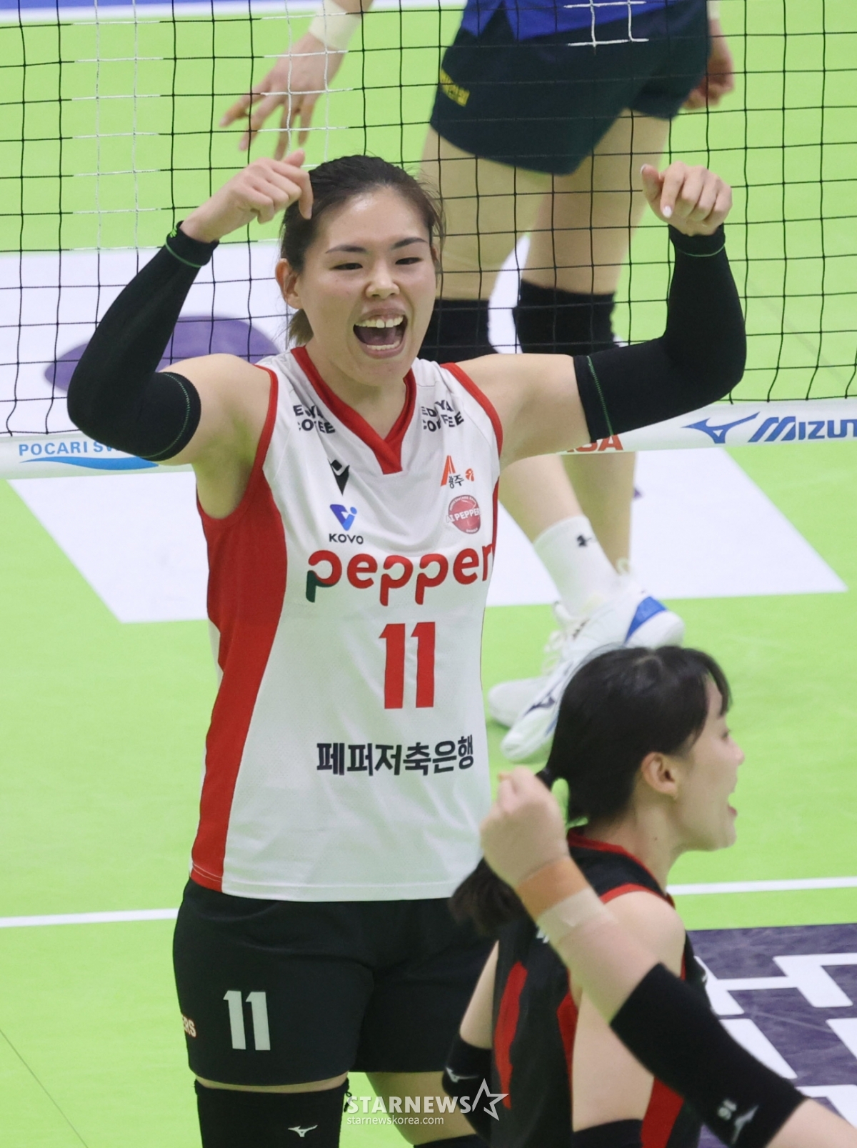 Pepper Savings Bank Shimamura is delighted after scoring a crucial point.