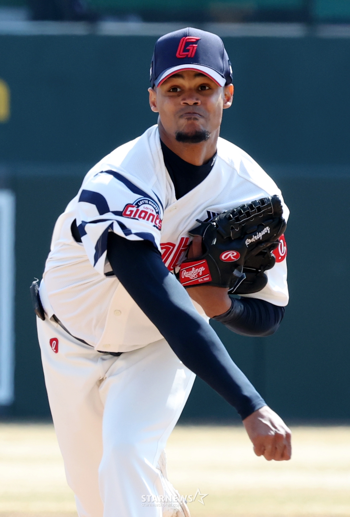 Lotte starter Rodriguez is pitching hard.