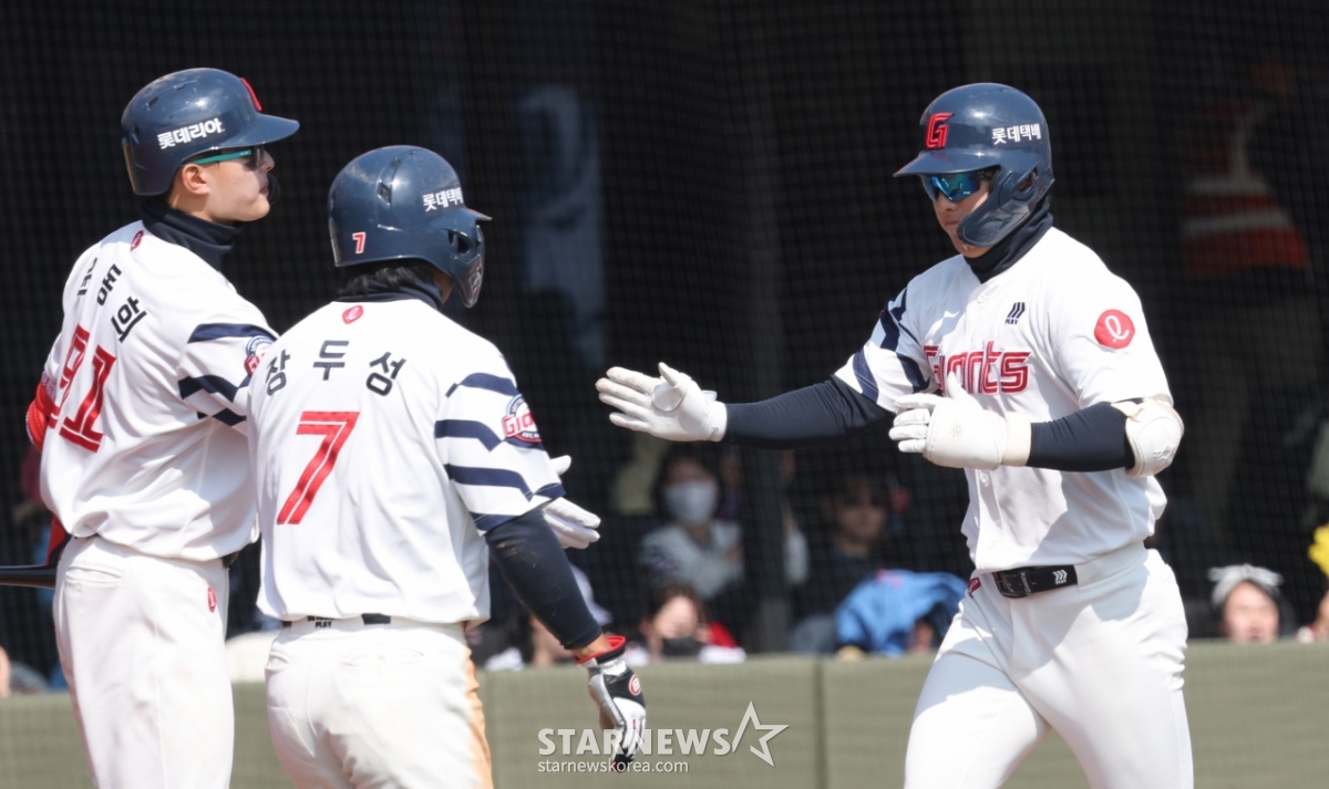 Lotte Han Tae-yang is home-in after hitting a two-run home run over the left-hand side in the bottom of the third inning with two outs and a runner on second base.