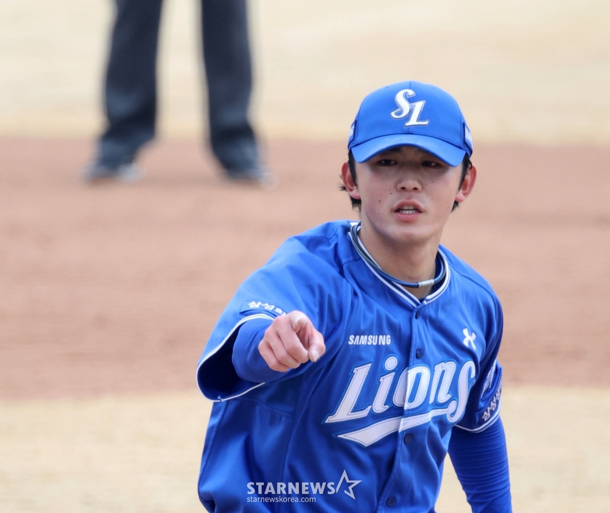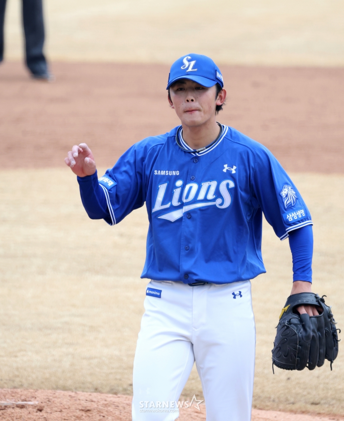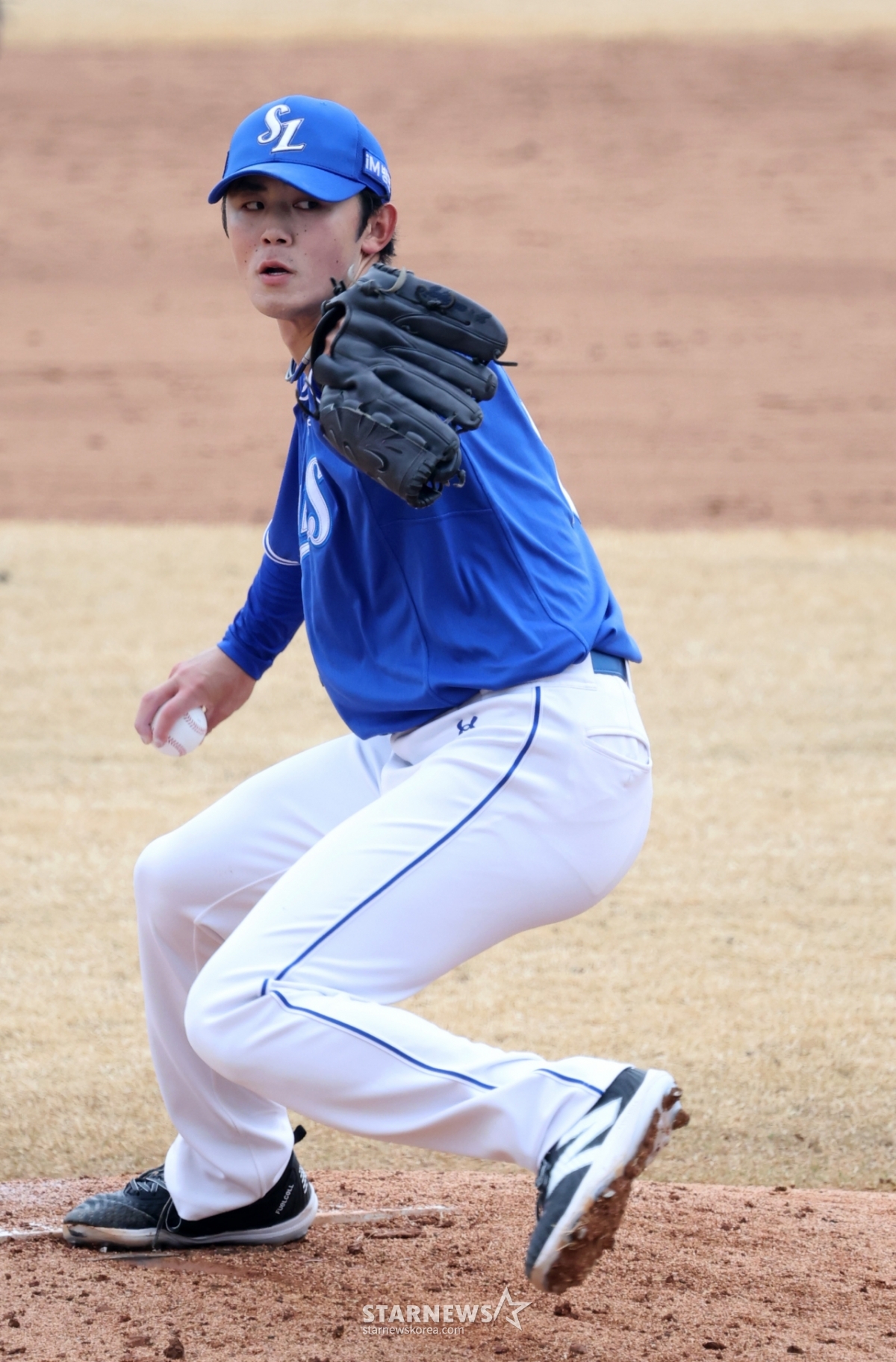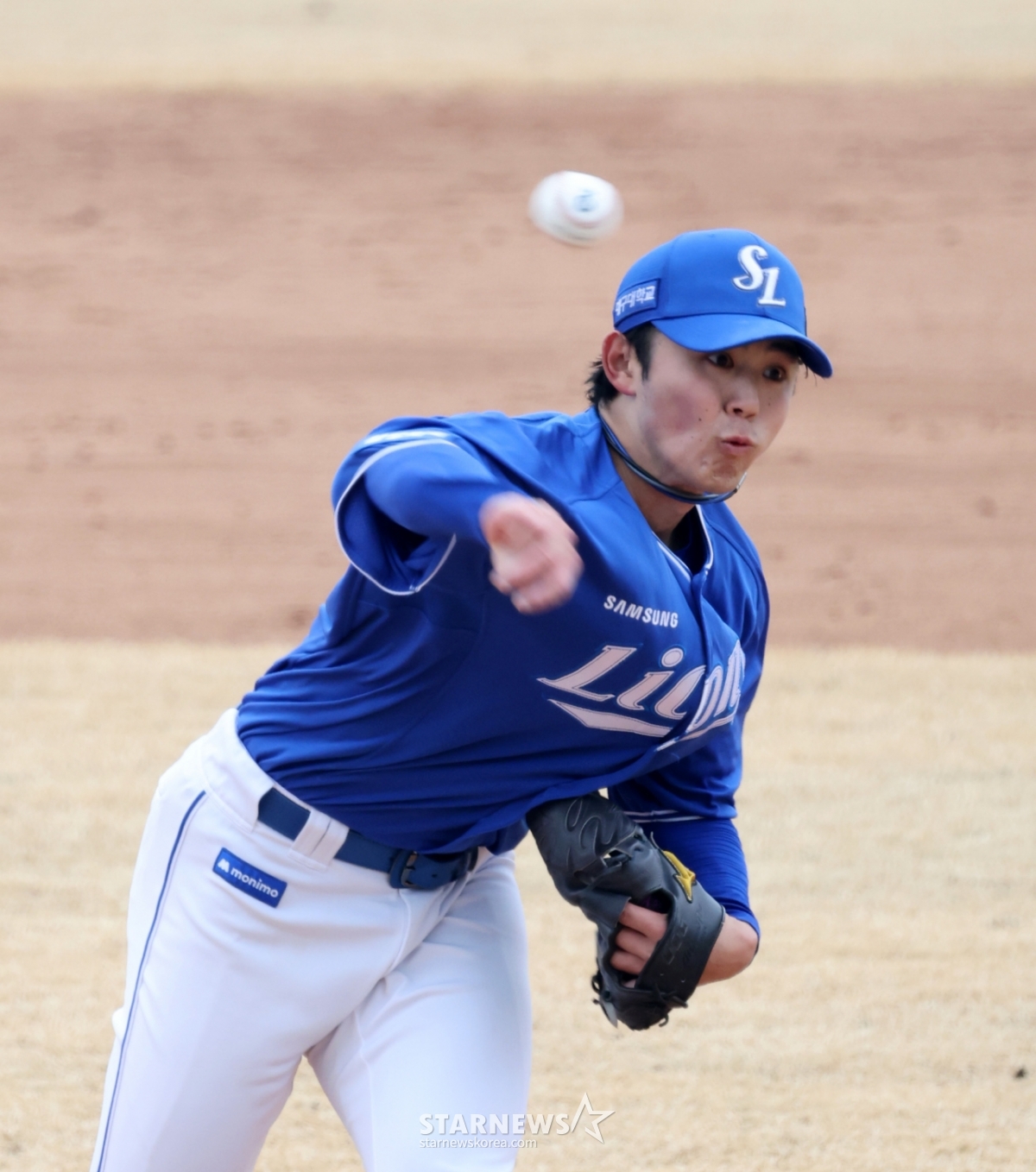 Samsung right-hander Miyaji is pitching hard in the 2026 professional baseball exhibition game between Doosan Bears and Samsung Lions at Doosan Bears Park in Icheon on the 15th. 2026.03.15.