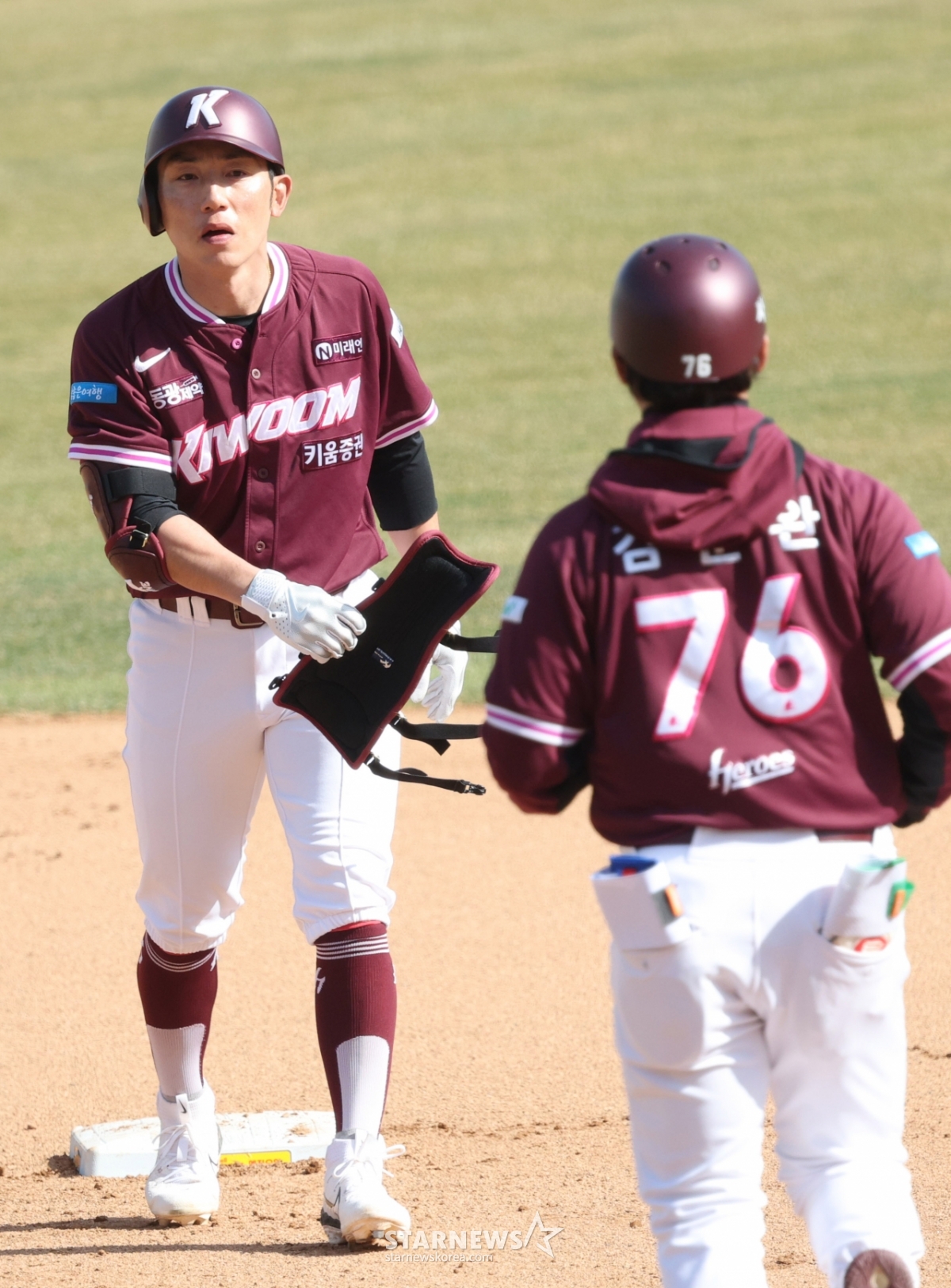 Kiwoom Seo Geon-chang is catching his breath after getting on base with a timely RBI double in the top of the eighth inning with no outs and runners on the first and third bases.
