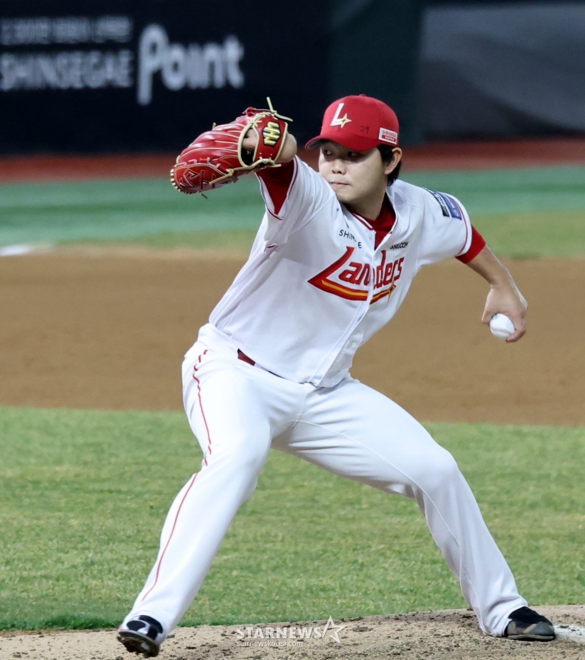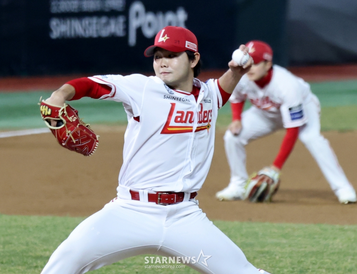 SSG left-hander Park Si-hoo takes the mound in the top of the ninth inning of the 1016 professional baseball exhibition game between SSG Landers and Kiwoom Heroes at Landers Field on the 22nd. 2026.03.22.