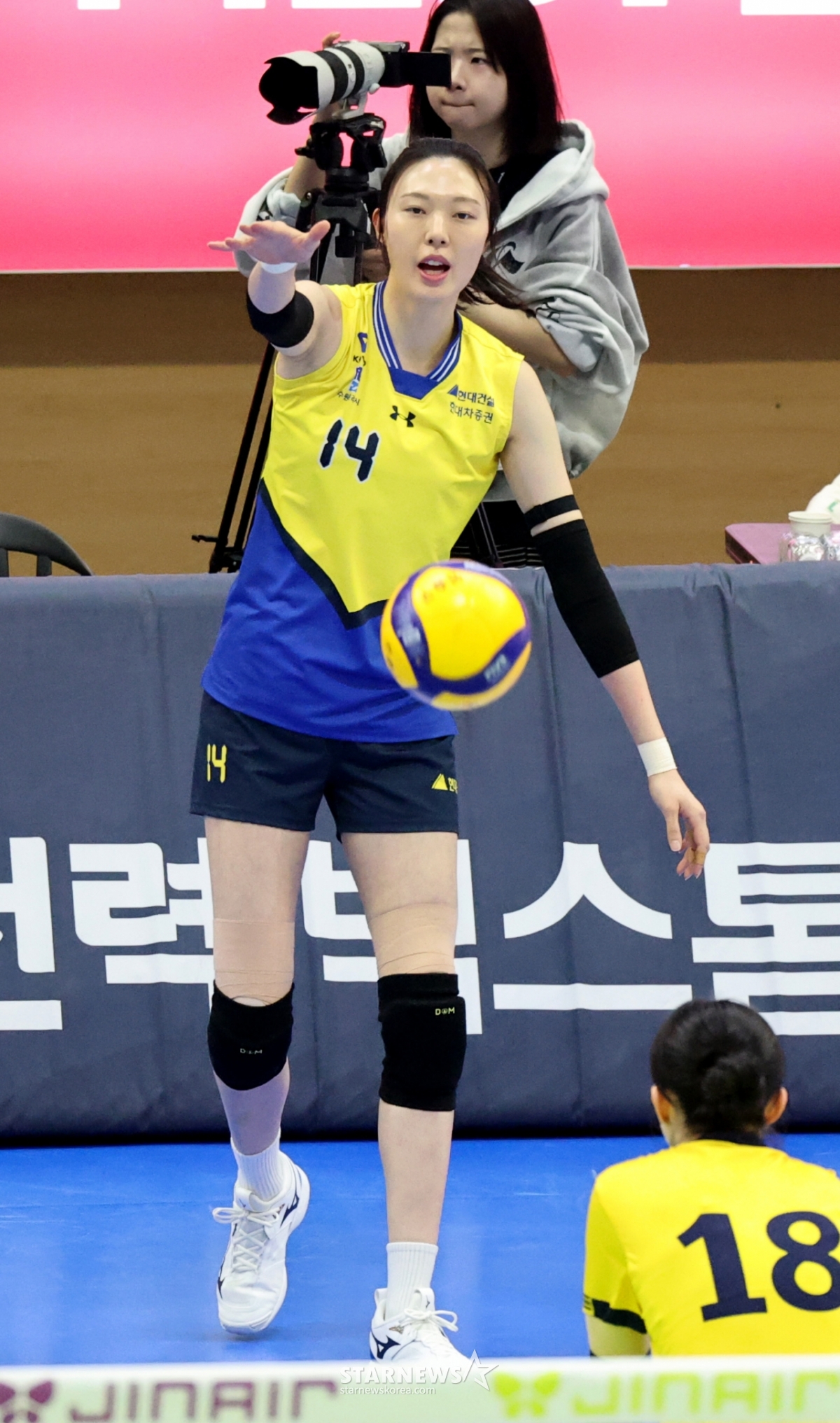 Hyundai Engineering & Construction's Yang Hyo-jin is warming up ahead of the 2025-2026 Jin Air V-League Hyundai Engineering & Construction and GS Keltex playoffs at Suwon Gymnasium on the 26th. .2026.03.26.
