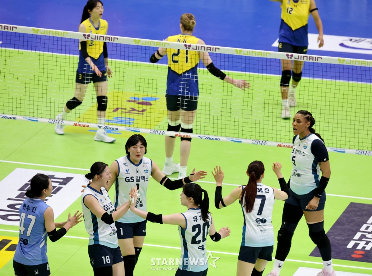 GS players, including Silva, are cheering by scoring in the 2025-2026 Jin Air V-League Hyundai Engineering & Construction and GS Keltex playoffs at Suwon Gymnasium on the 26th. .2026.03.26.
