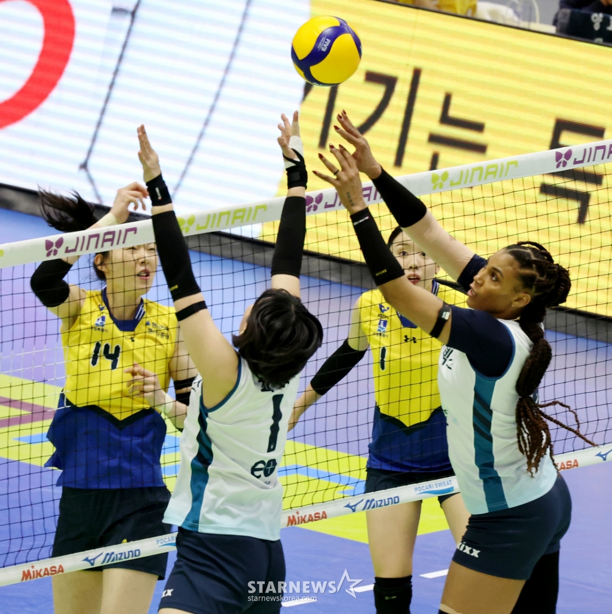 Silva is blocking Yang Hyo-jin's attack in the 2025-2026 Jin Air V-League Hyundai Engineering & Construction and GS Keltex playoffs at Jungsuwon Gymnasium on the 26th. .2026.03.26.