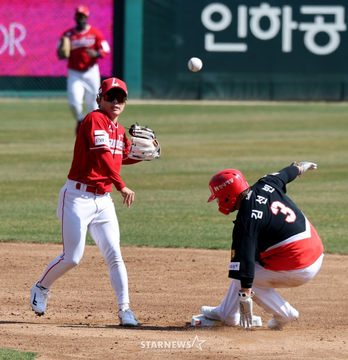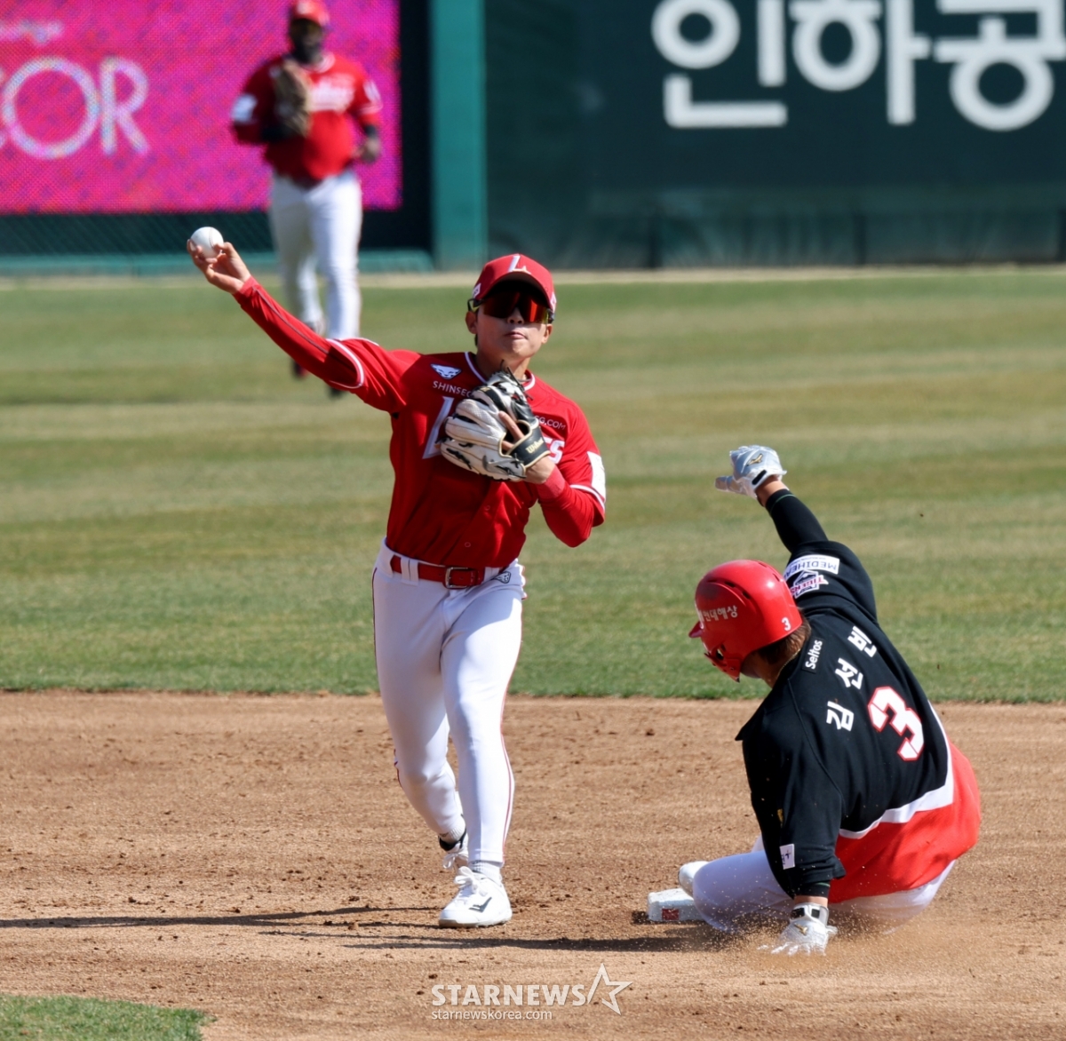 Landers second baseman Jung Joon-jae throws to first base after forcing out first baseman Kim Sun-bin to second base in the top of the third inning of the opening game of the 2026 professional baseball SSG Landers and KIA Tigers at SSG Landers Field in Incheon on the 28th. The batter at first base is safe. 2026.03.28.