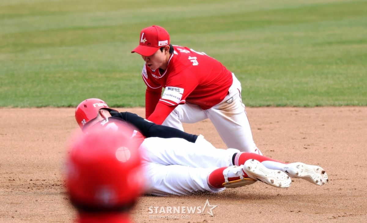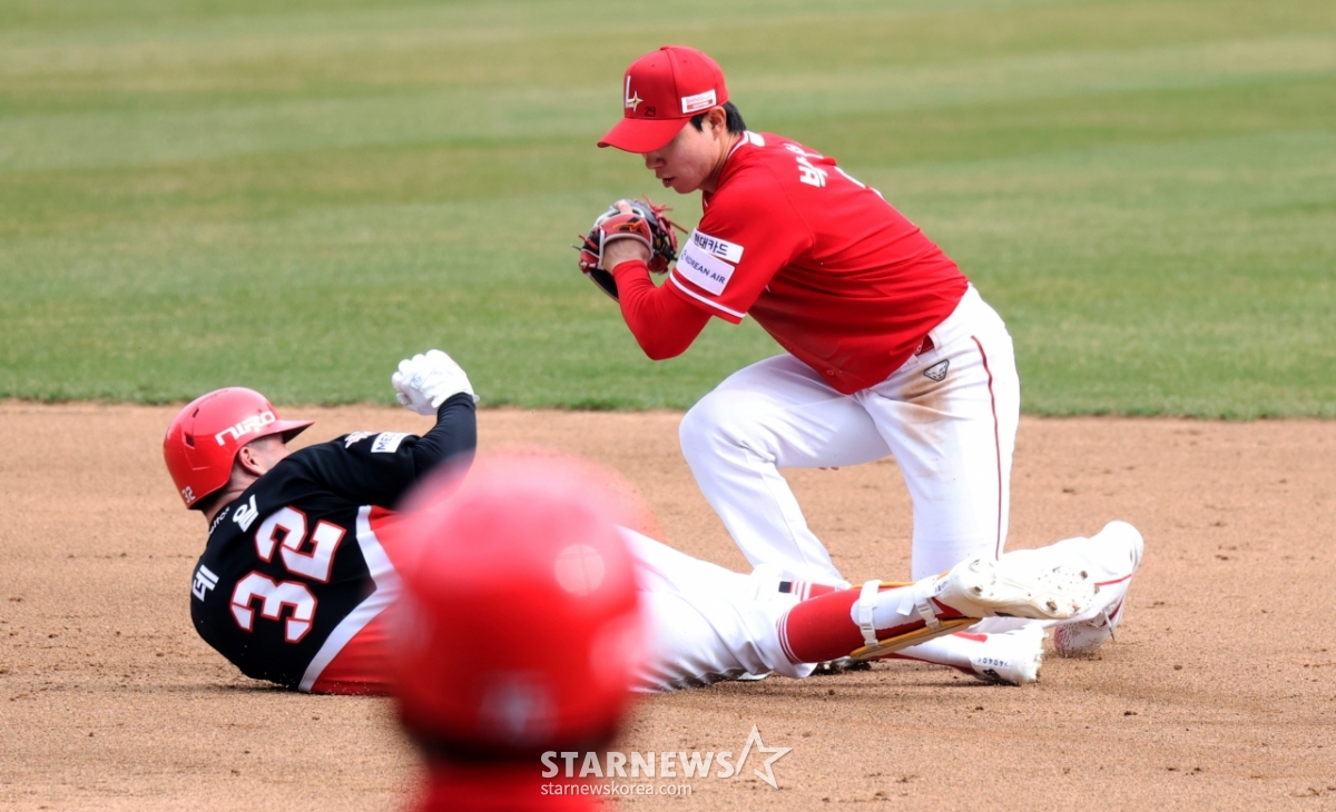 Kia's No. 9 hitter Dale is safe at second base after hitting an RBI double with two outs in the top of the fourth inning of the 2026 professional baseball SSG Landers and KIA Tigers game at SSG Landers Field in Incheon on the 29th.. 2026.03.29.
