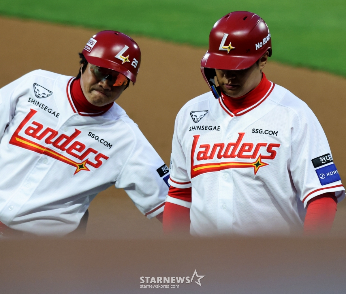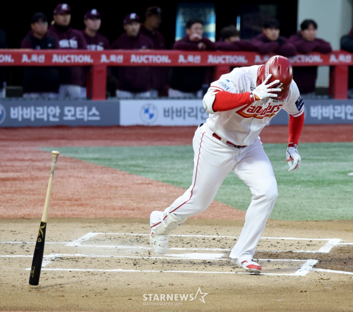 Landers' No. 4 hitter Kim Jae-hwan is heading to the dugout as a leadoff hitter in the bottom of the second inning of the 2026 professional baseball game between SSG Landers and Kiwoom Heroes at SSG Landers Field in Incheon on the 31st. Kim Jae-hwan, who has a hitless record with a walk of 10 at-bats. 2026.03.31.