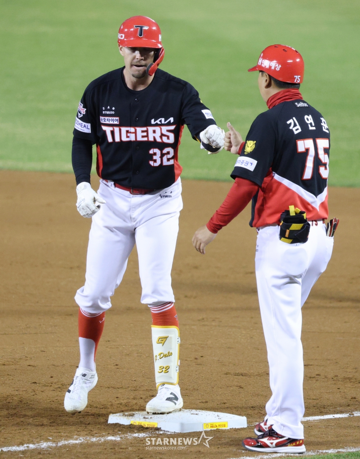 KIA Dale is welcomed by coach Kim Yeon-hoon after hitting an RBI timely hit with two outs and runners on the first and third bases in the top of the third inning.