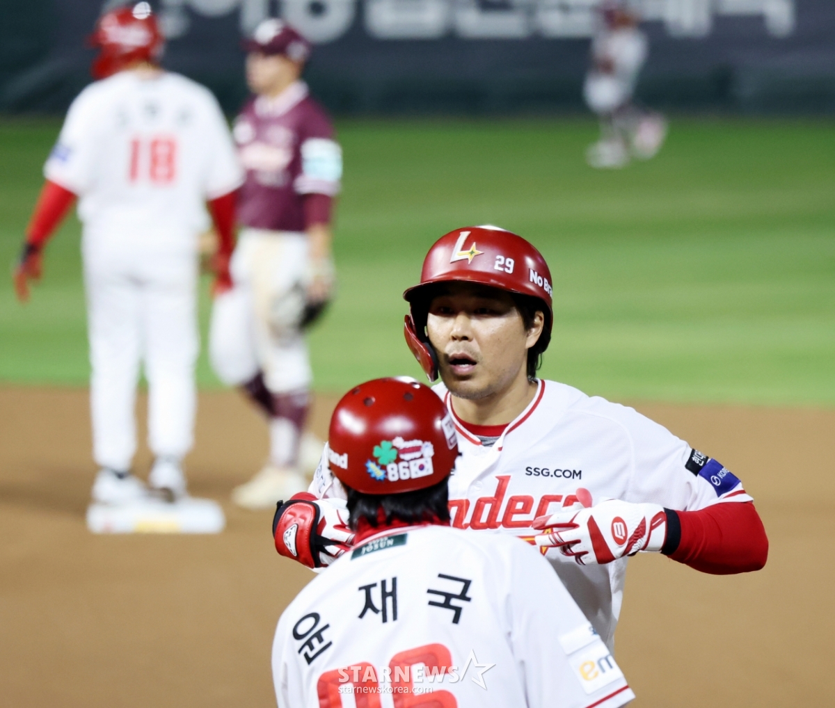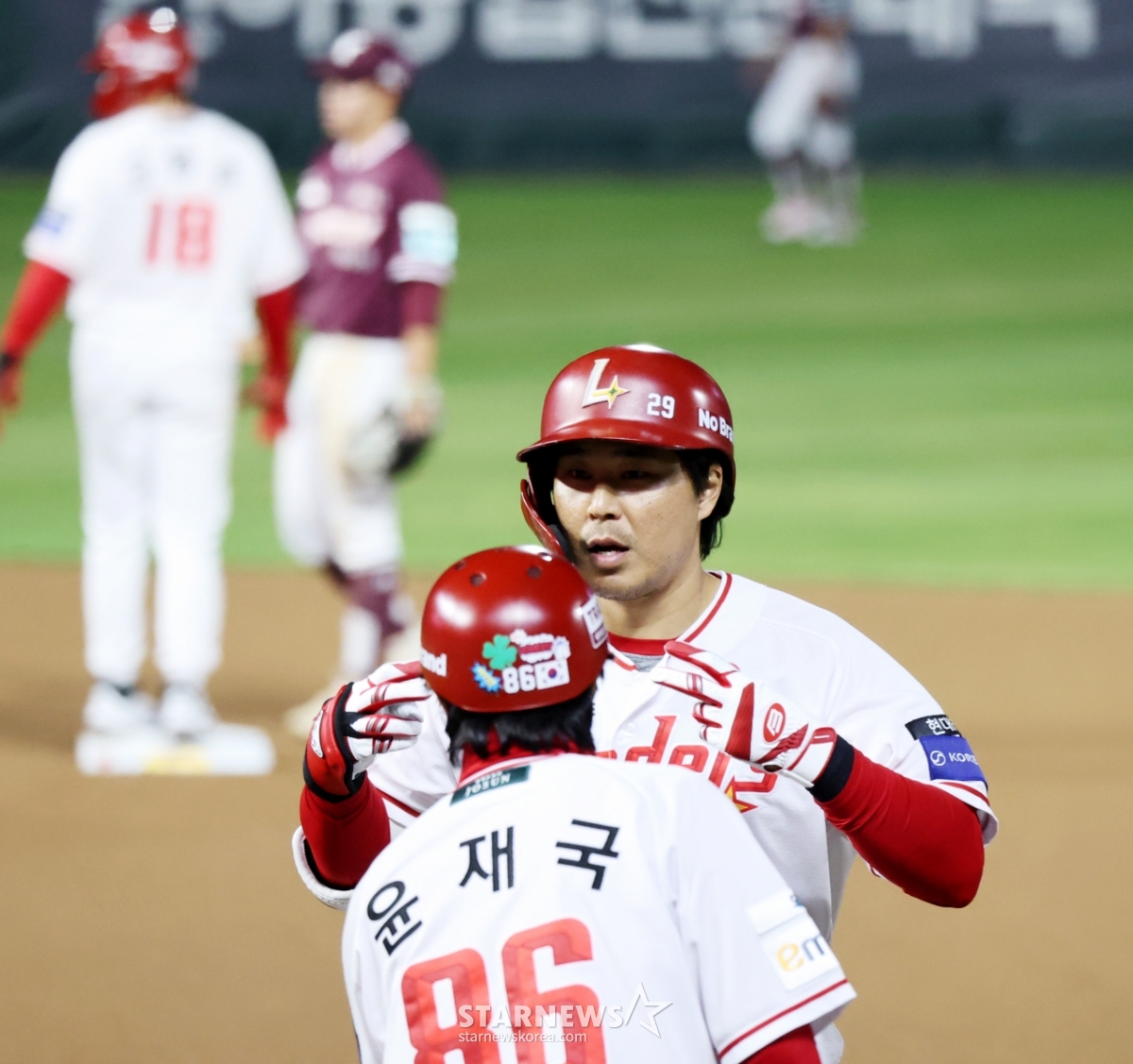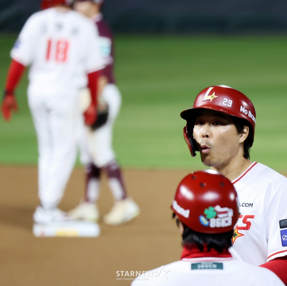 Landers' No. 6 hitter Han Yoo-sum is on base with a hit in the bottom of the fourth inning of the 2026 professional baseball game between SSG Landers and Kiwoom Heroes at SSG Landers Field in Incheon on the 31st. 2026.03.31.