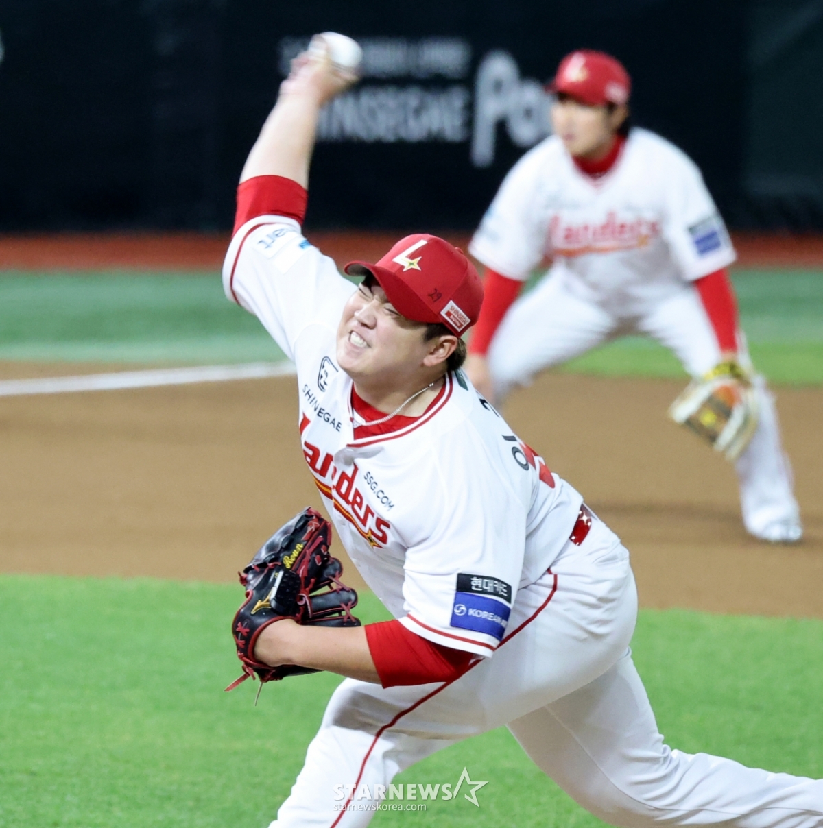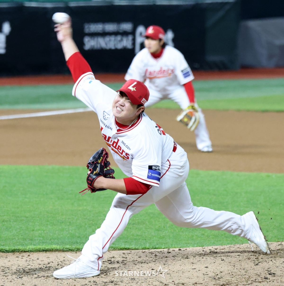 Landers right-handed bullpen Lee Won-woon is pitching hard in the top of the sixth inning of the 2026 professional baseball game between SSG Landers and Kiwoom Heroes at SSG Landers Field in Incheon on the 31st. 2026.03.31.