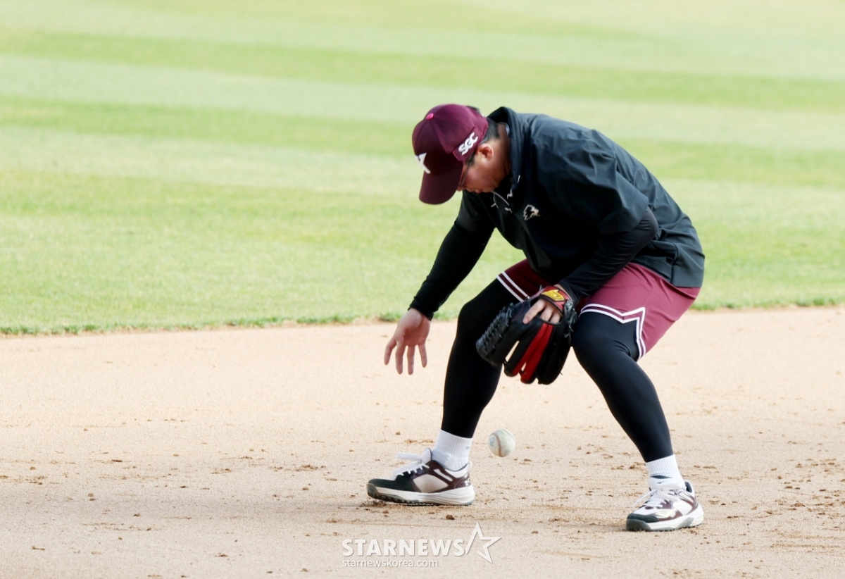 Kiwoom An Chi-hong is training for defense on the third base ahead of the 2026 professional baseball game between SSG Landers and Kiwoom Heroes at SSG Landers Field in Incheon on the 1st. 2026.04.01.