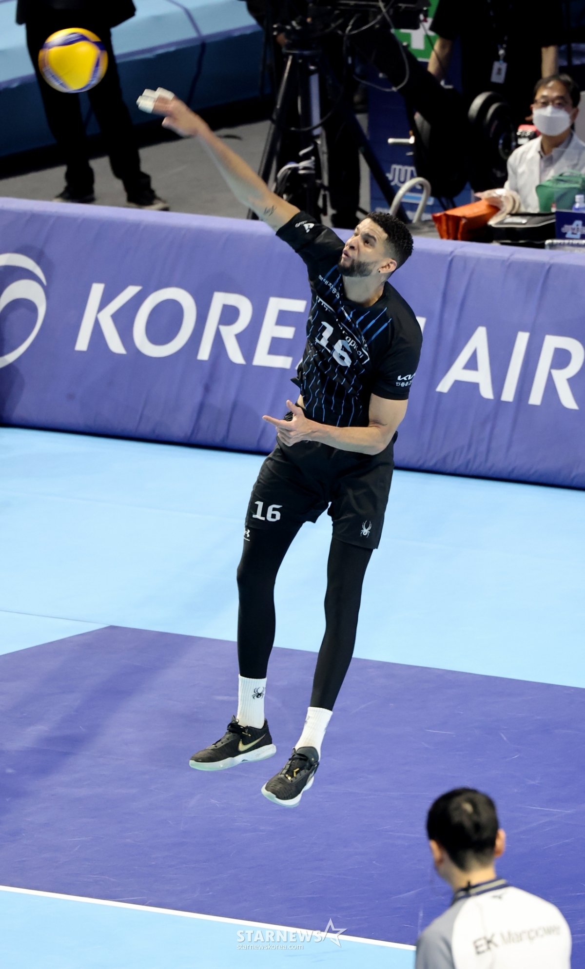 Hyundai Leo is attempting a spike serve in the Jin Air 2025-2026 V-League Championship match between Korean Air and Hyundai Capital held at Gyeyang Gymnasium on the 3rd. 2026.04.03.