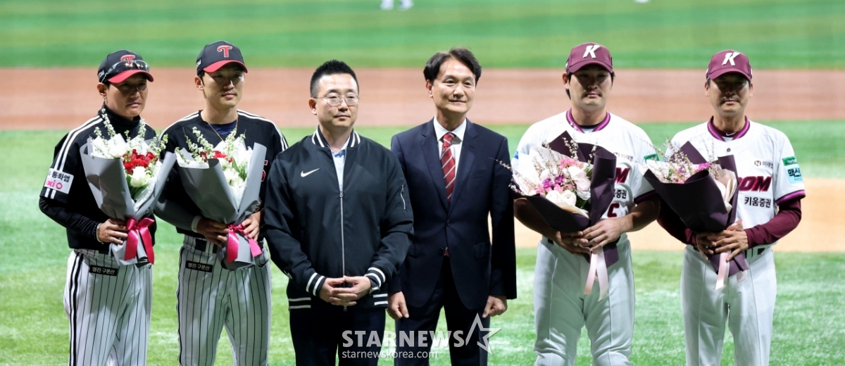 LG manager Yeom Kyung-yeop, Kiwoom manager Seol Jong-jin, Kiwoom captain Lim Ji-yeol and LG captain Park Hae-min attend the opening ceremony of Gocheok ahead of the 2026 KBO League Kiwoom Heroes and LG Twins match at Yeochuk Sky Dome on the 4th. 2026.04.03.