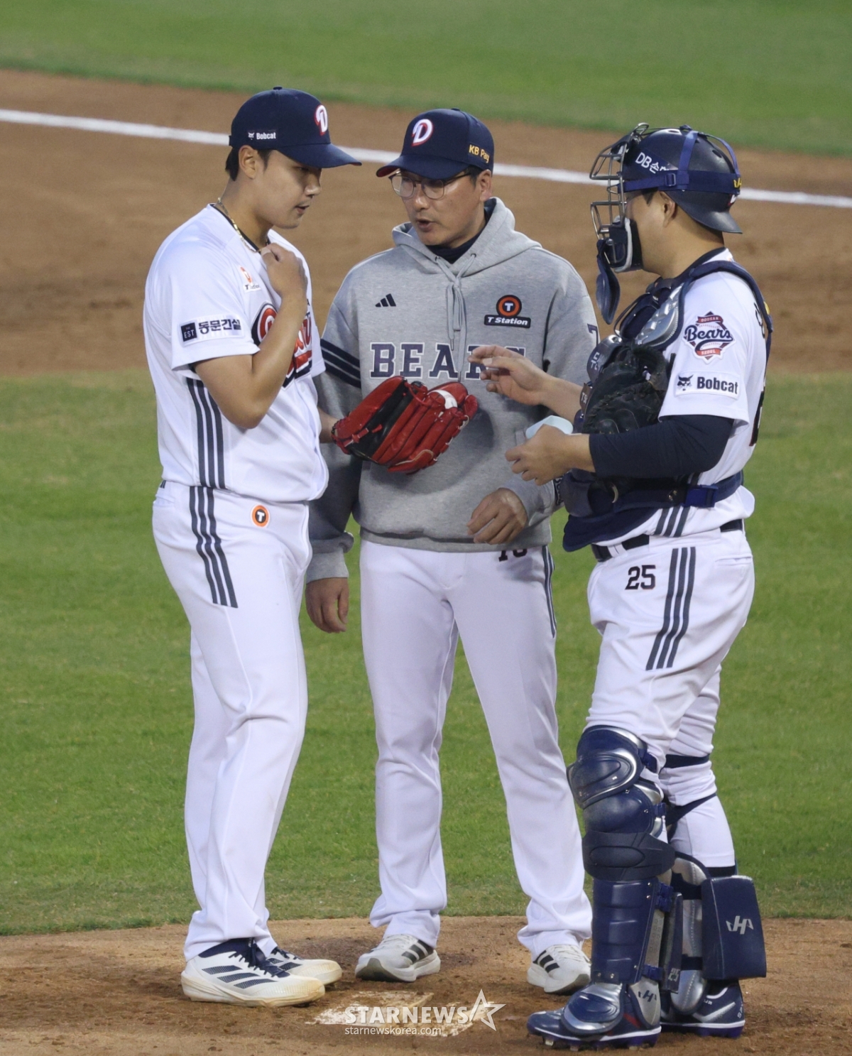 When Doosan's Yang Jae-hwan, who took the mound in relief in the second inning, showed signs of shaking, the pitching coach goes to the mound to calm him down