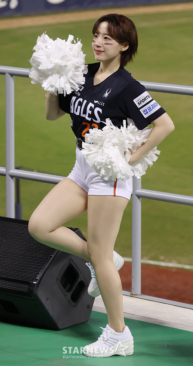 Hanwha cheerleader Ha Ji-won is cheering cheerfully.